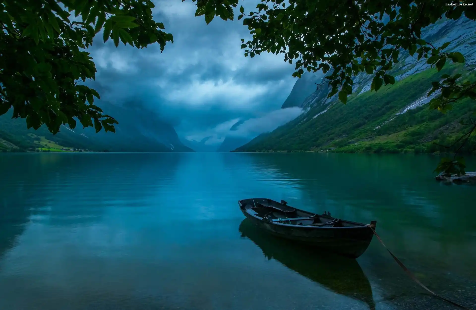 Łódź, Norwegia, Jezioro Jølstravatn, Wieczór, Góry na Komórkę
