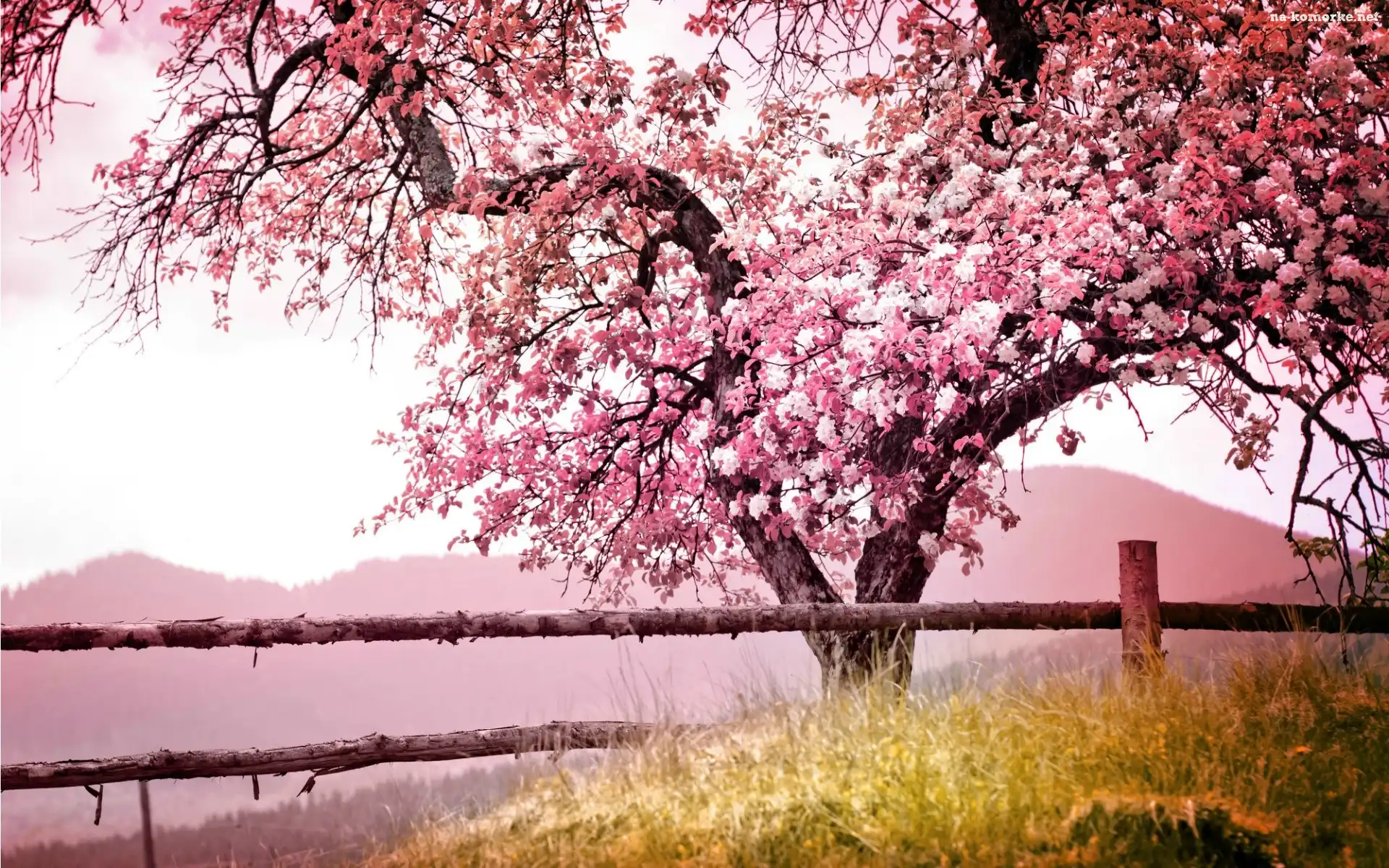 Góry, Drzewo, Kwitnące, Poranek, Ogrodzenie, Łąka na Komórkę