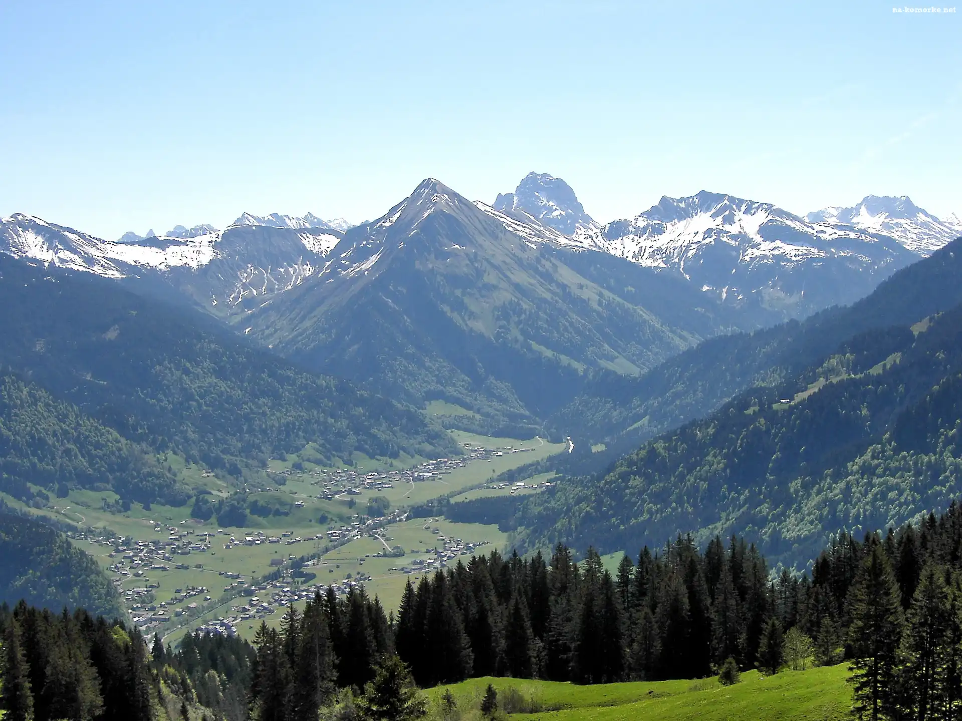 Góry, Austria, Kanisfluh, Drzewa, Ośnieżone, Dolina na Komórkę