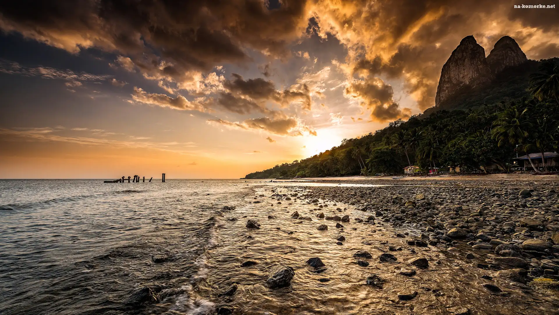 Palmy, Góry, Morze, Chmury, Wschód słońca, Plaża na Komórkę