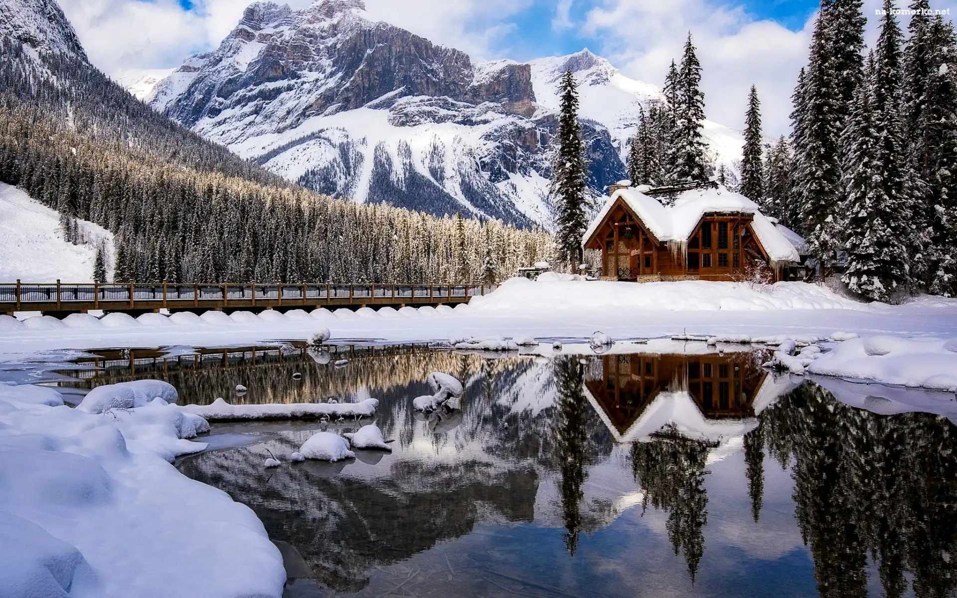 Kanada, Dom, Góry, Zima, Park Narodowy Yoho, Jezioro Emerald, Most, Drzewa na Komórkę