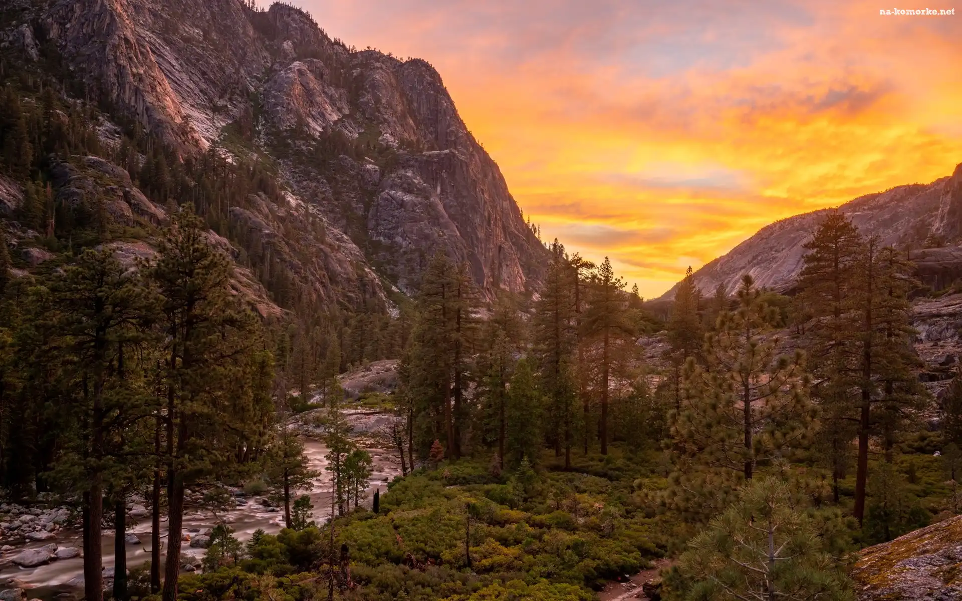 Zachód słońca, Drzewa, Stany Zjednoczone, Skały, Góry, Rzeka Tuolumne, Park Narodowy Yosemite, Wielki Kanion Tuolumne, Kalifornia na Komórkę |