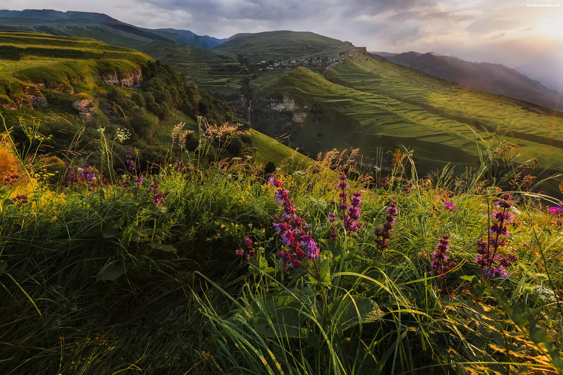 Góry, Kwiaty, Tarasy, Rosja, Polana, Zachód Słońca, Kaukaz Północny, Dagestan na Komórkę
