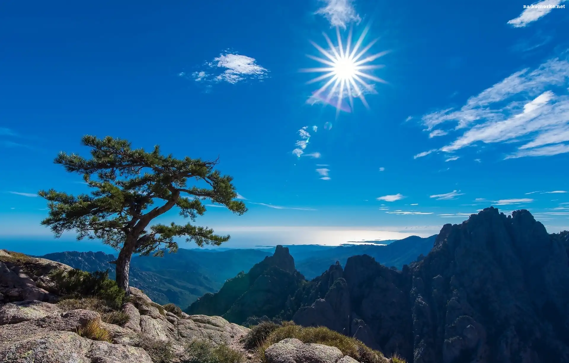 Góry, Drzewo, Skały, Promienie Słońca na Komórkę