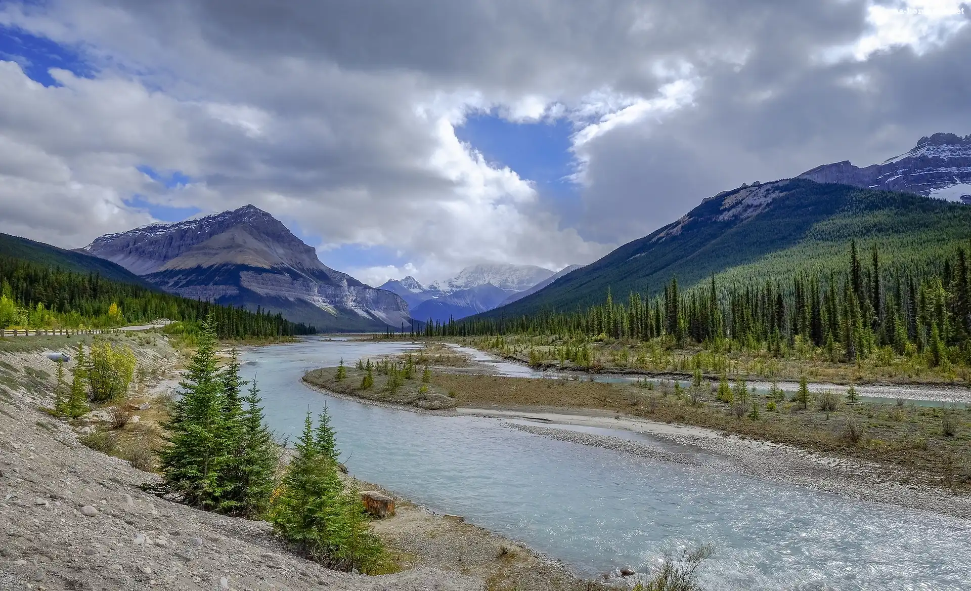 Góry, Chmury, Rzeka, Drzewa na Komórkę