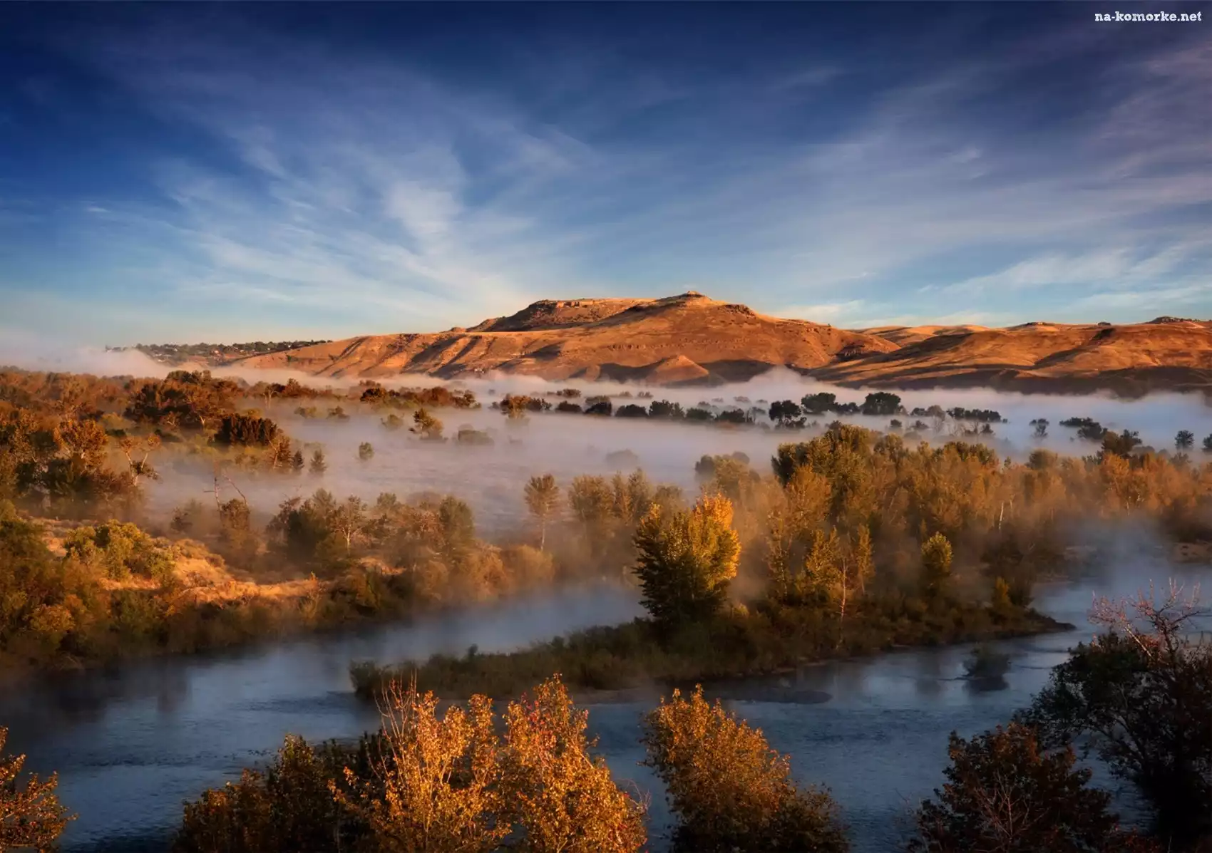 Góry, Drzewa, Rzeka, Mgła na Komórkę
