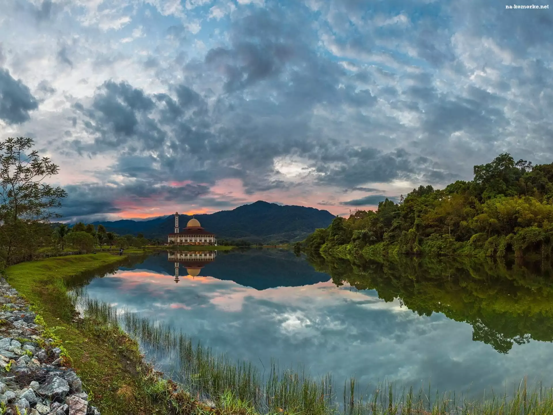 Góry, Chmury, Malezja, Drzewa, Rzeka, Las na Komórkę