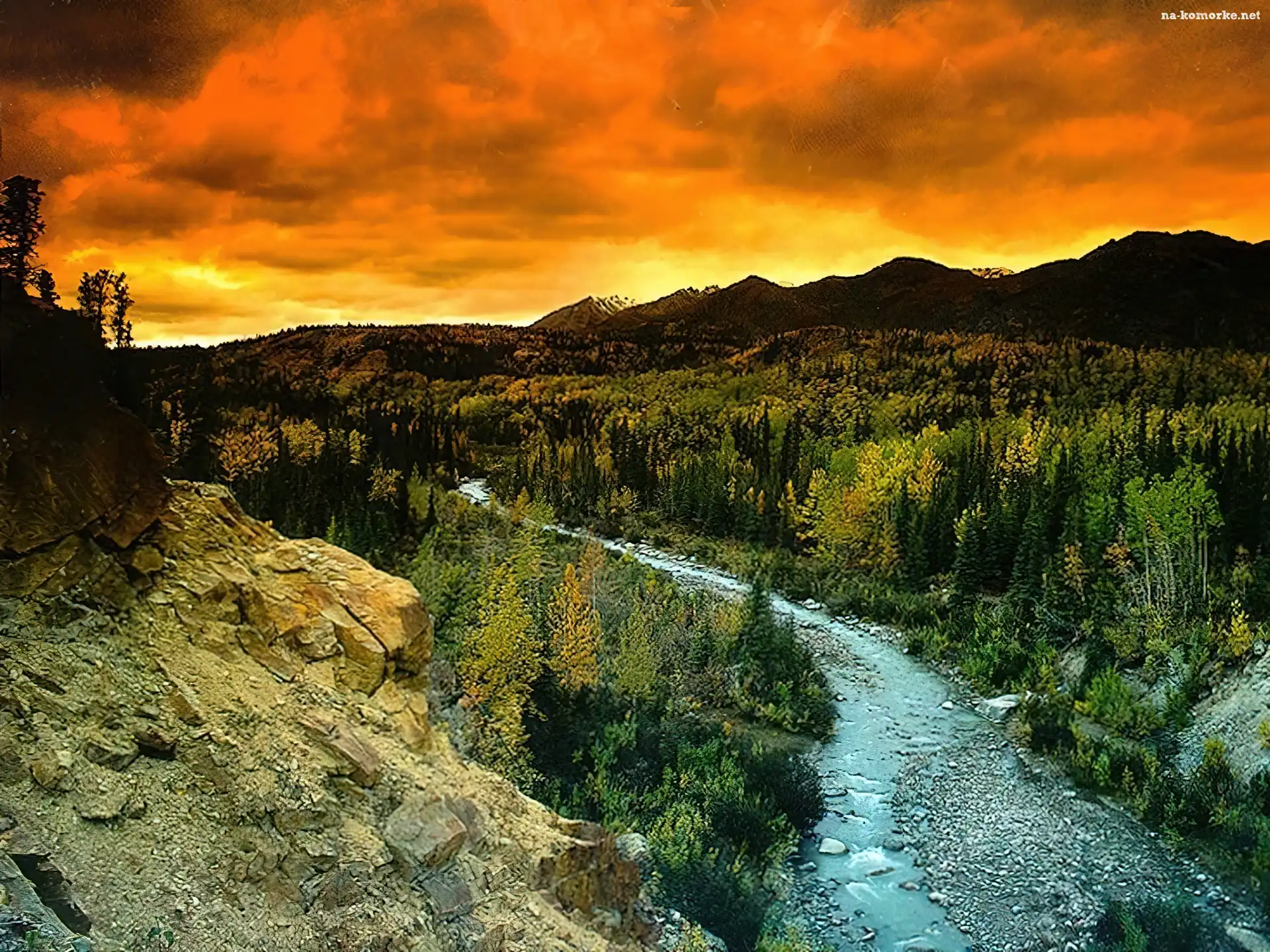 Góry, Słońca, Rzeka, Zachód na Komórkę