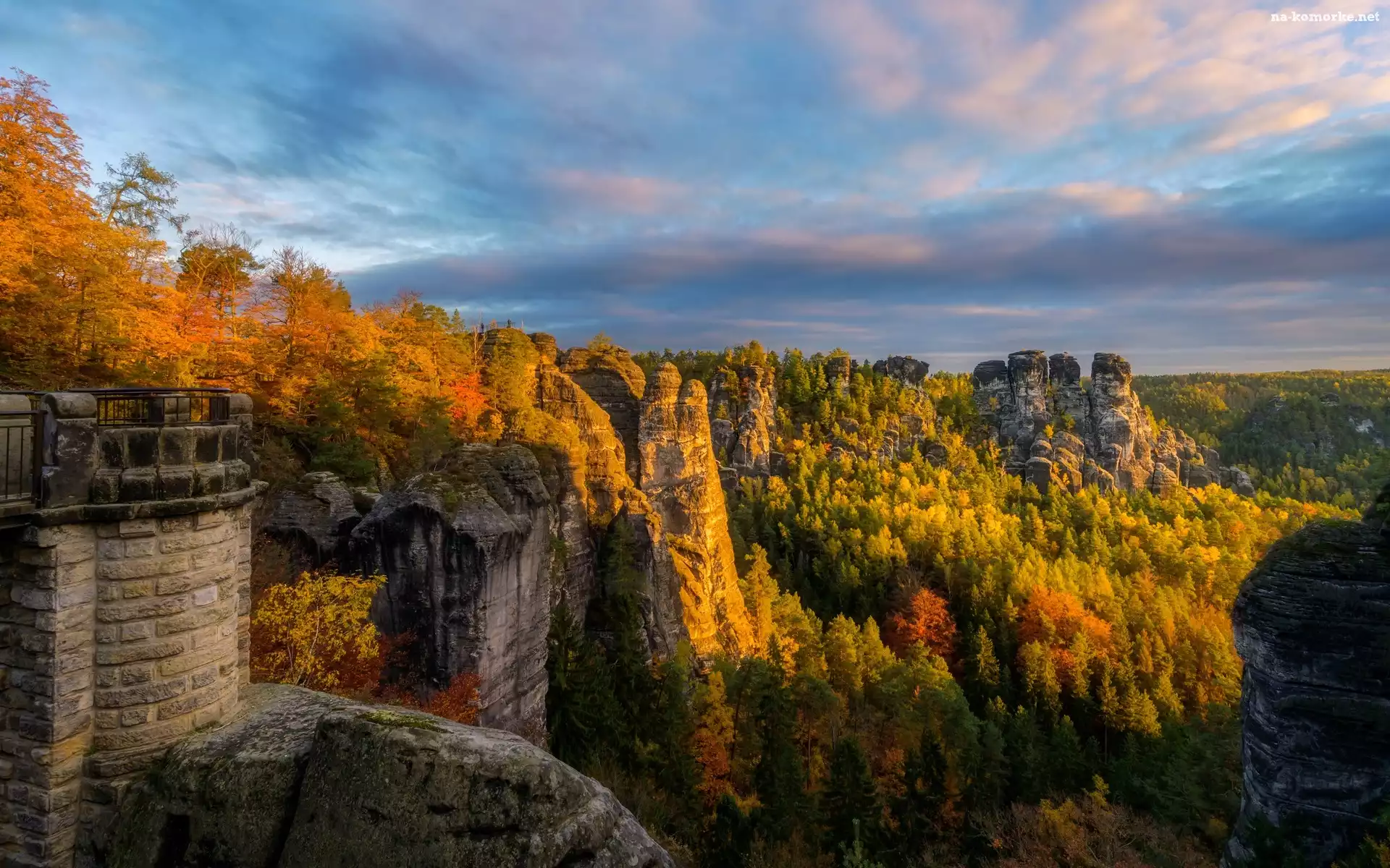 Skały, Las, Chmury, Góry Połabskie, Park Narodowy Saskiej Szwajcarii, Saksonia, Niemcy, Drzewa, Jesień na Komórkę |
