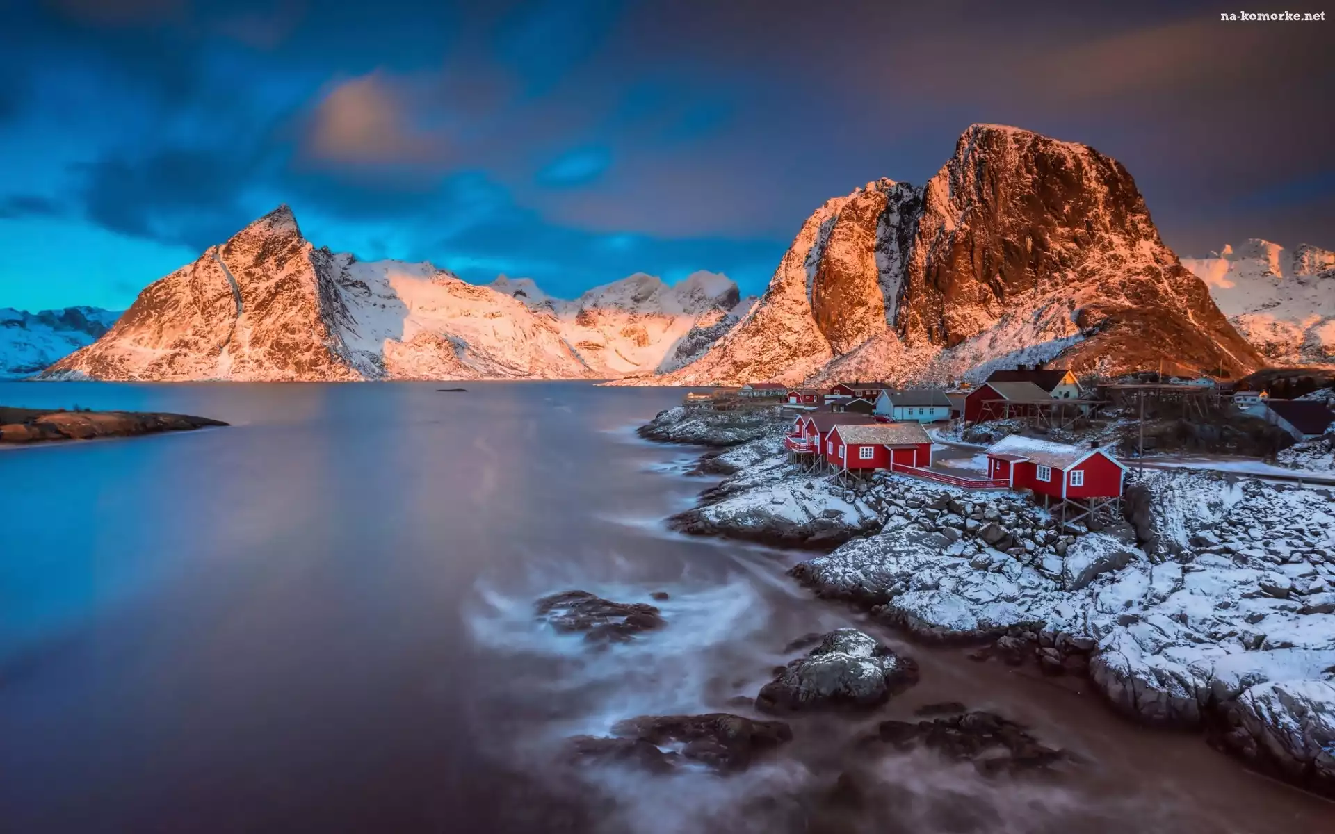Skały, Góry, Lofoty, Norwegia, Morze, Domki Rybackie na Komórkę