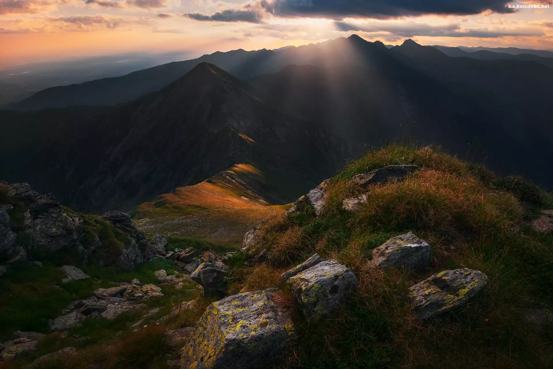 Góry, Wschód słońca, Skały, Trawa na Komórkę