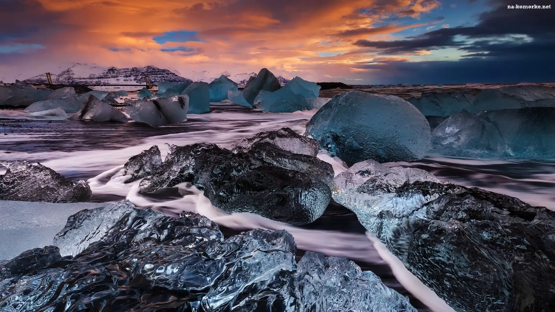 Islandia, Zachód słońca, Zima, Jezioro Jokulsarlon, Bryły, Lód, Góry na Komórkę