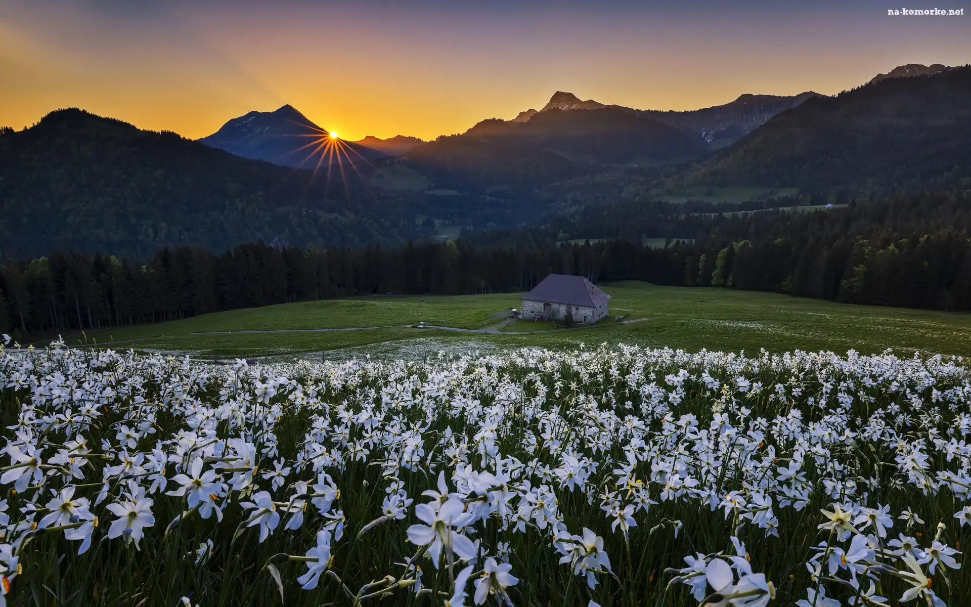 Góry, Las, Narcyzy, Pole, Drzewa, Zachód słońca, Dom, Kwiaty na Komórkę