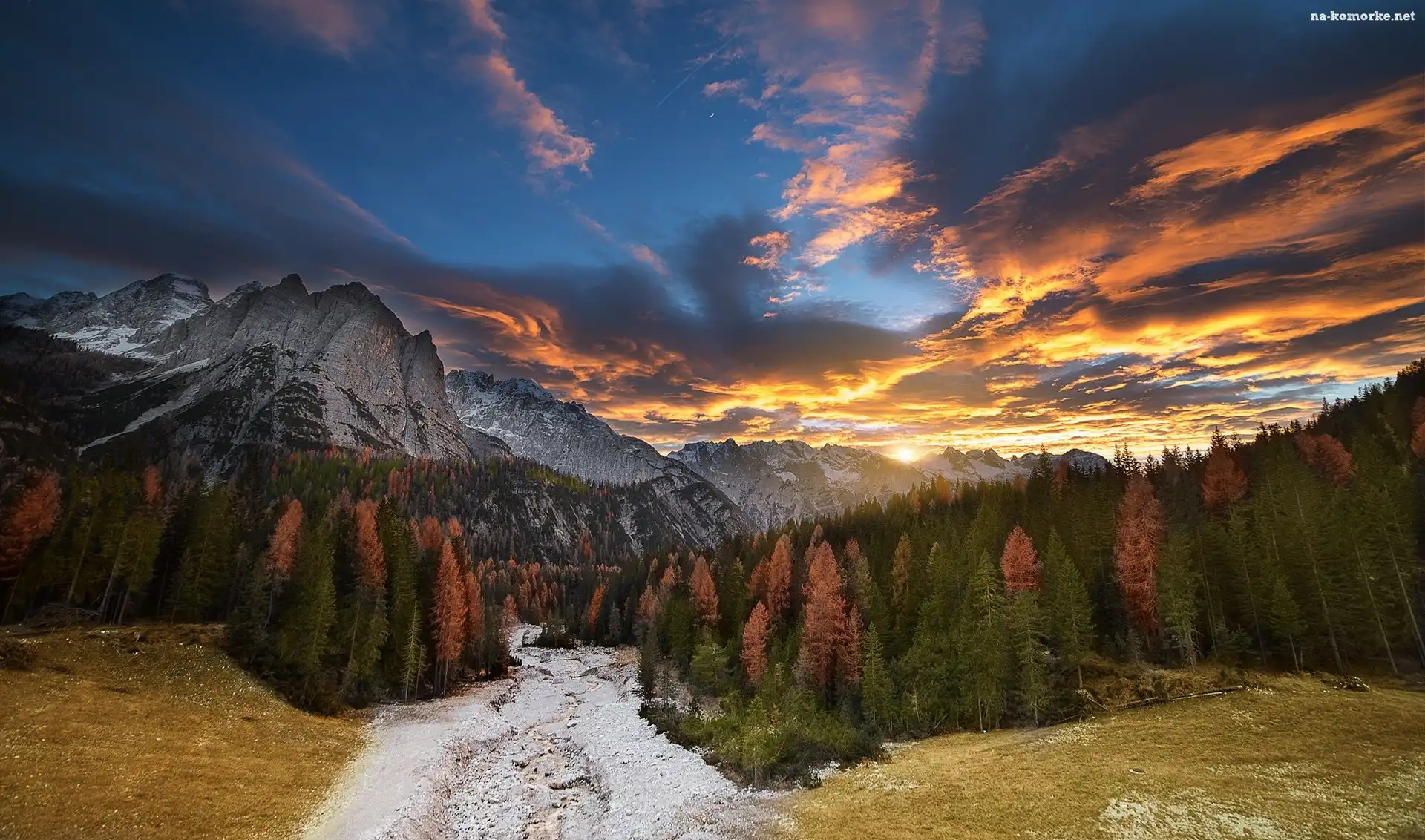 Góry, Śnieg, Zachód słońca, Las na Komórkę