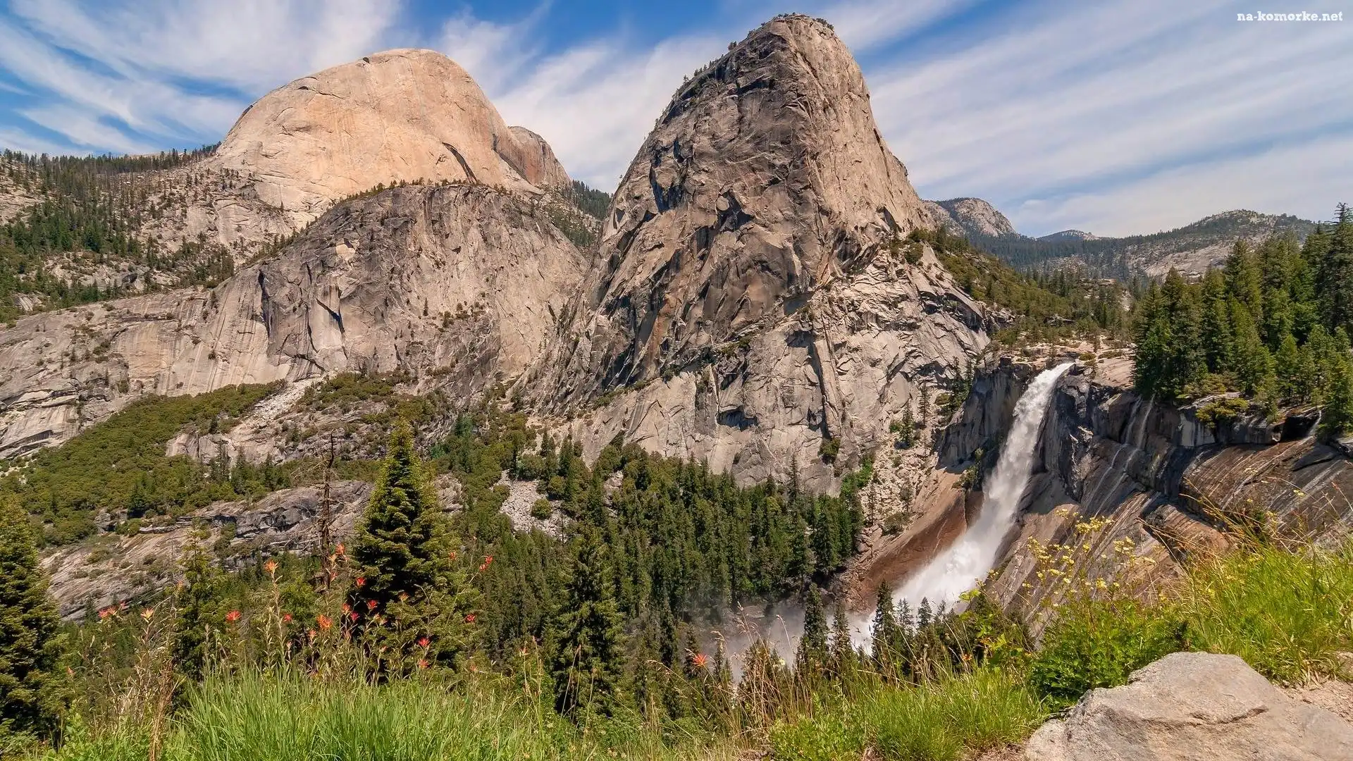 Góry, Kalifornia, Wodospad, Stany Zjednoczone, Sierra Nevada, Nevada Fall, Drzewa, Park Narodowy Yosemite na Komórkę |