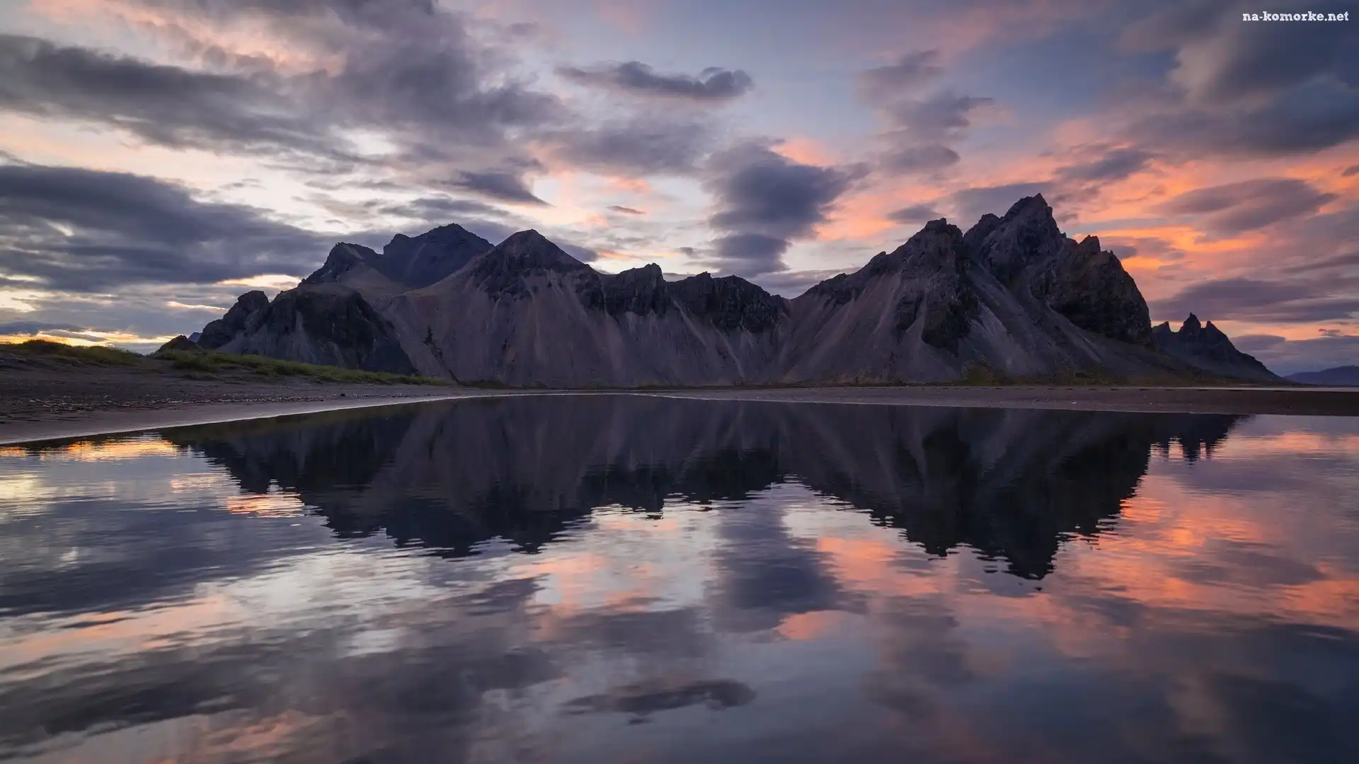 Odbicie, Plaża Stokksnes, Poranek, Islandia, Vestrahorn, Morze, Góry na Komórkę