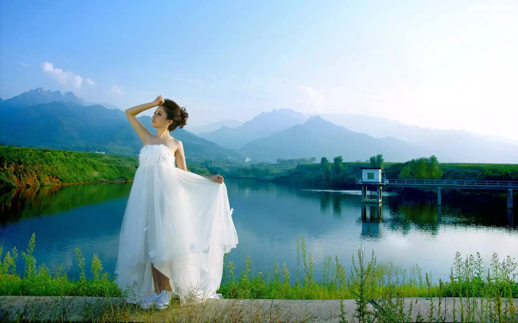 Góry, Kobieta, Biała, Sukienka, Jezioro na Komórkę