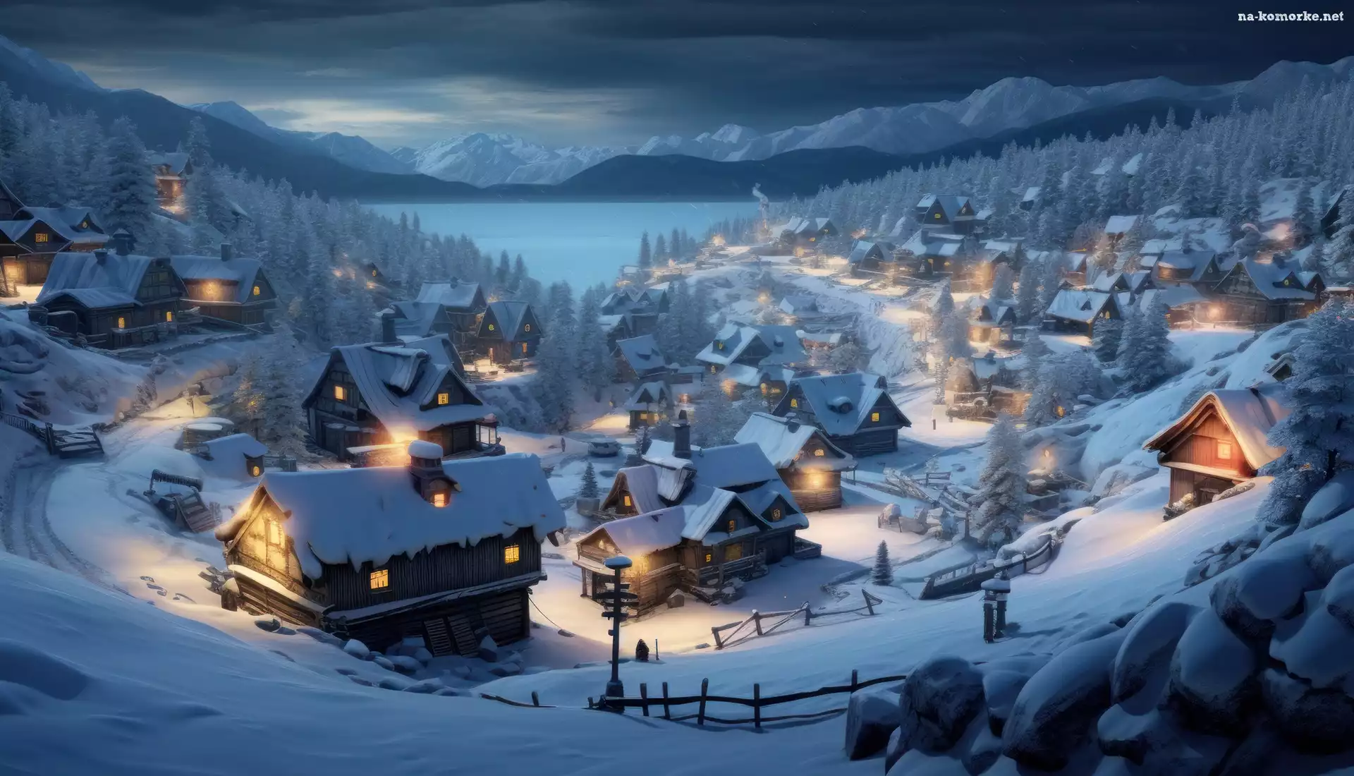 Domy, Drzewa, Światła, Zima, Noc, 2D, Jezioro, Góry na Komórkę