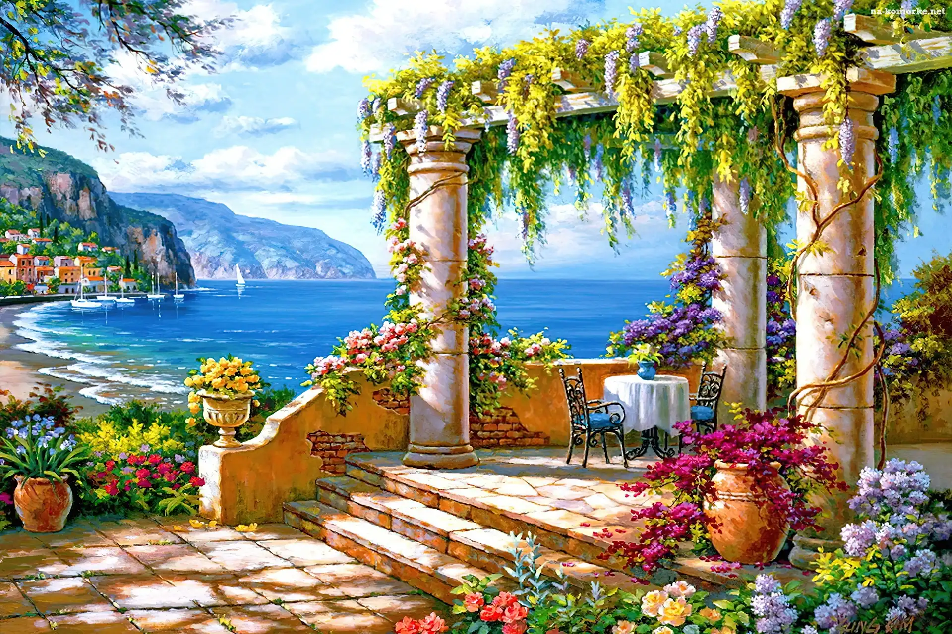 Taras, Góry, Widok, Patio, Kwiaty, Stolik, Morze na Komórkę