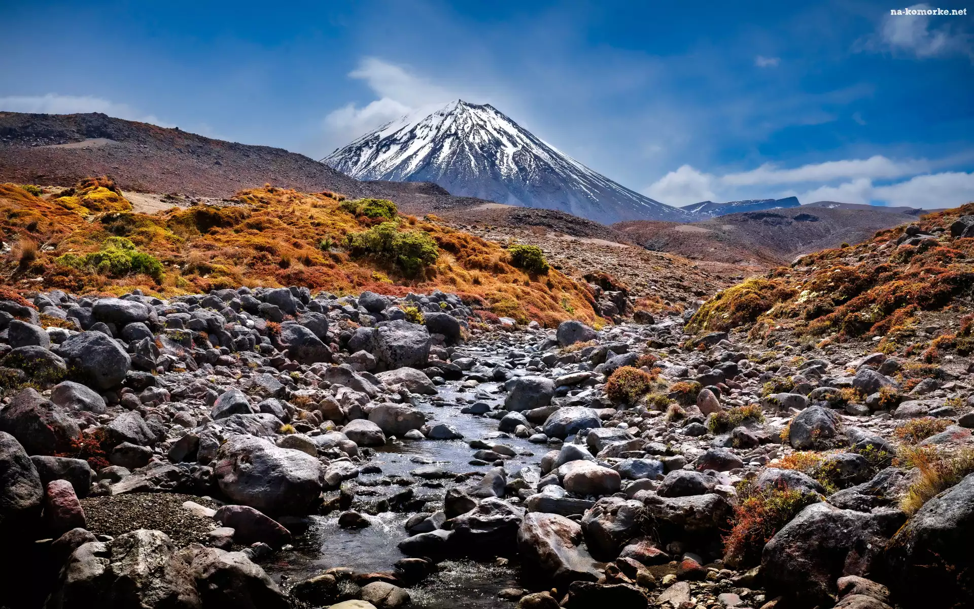 Park Narodowy Tongariro, Roślinność, Potok, Nowa Zelandia, Kamienie, Niebo, Góry, Wulkan Ngauruhoe na Komórkę |
