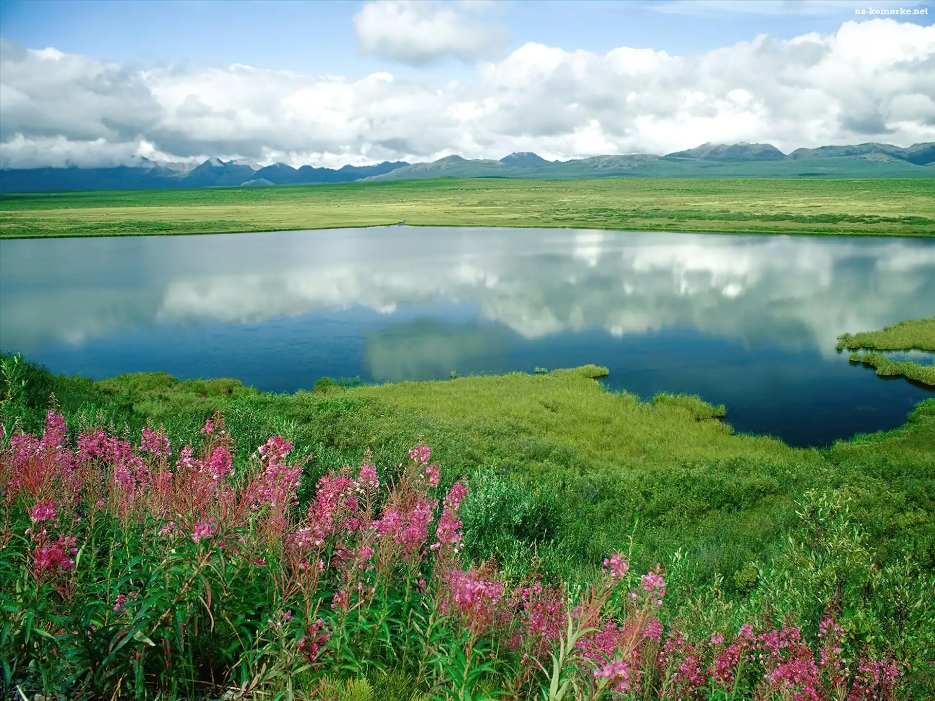 Góry, Alaska, Woda, Trawa, Kwiaty na Komórkę