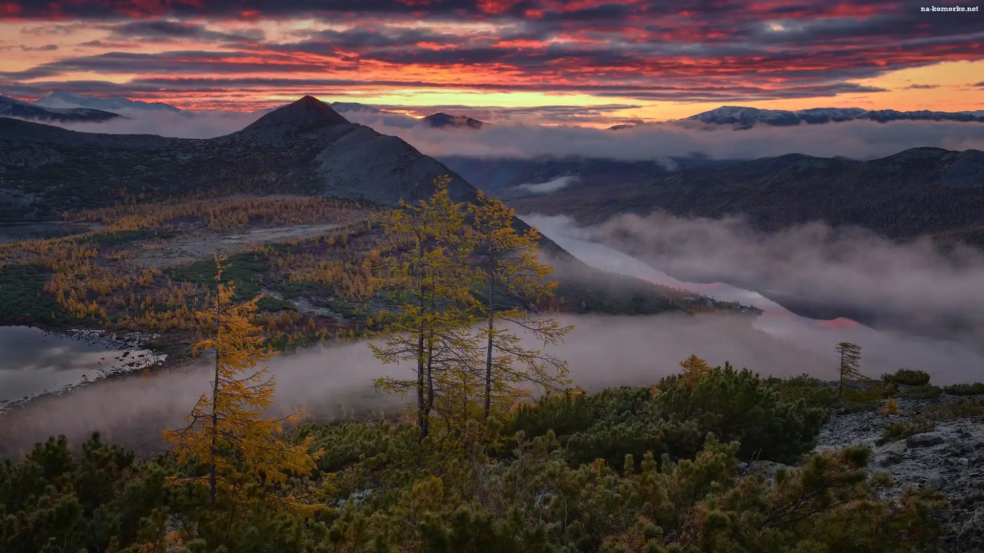Kołyma, Drzewa, Wschód słońca, Jesień, Mgła, Rosja, Góry na Komórkę