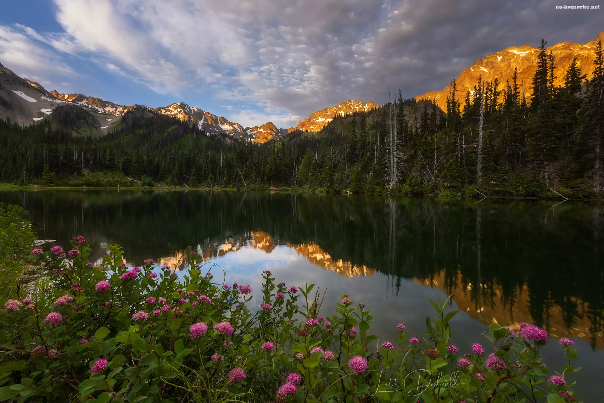 Krzewy, Kwiaty, Wschód Słońca, Odbicie, Drzewa, Jezioro, Góry na Komórkę