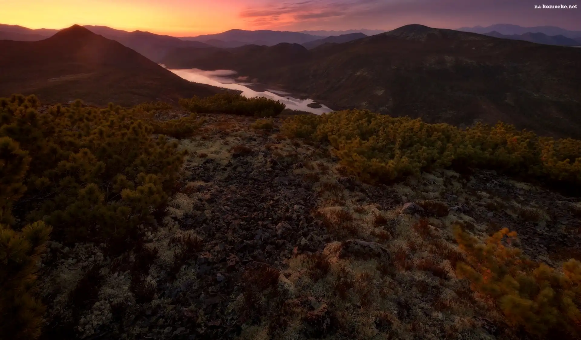 Zachód Słońca, Obwód magadański, Rosja, Góry Kołymskie, Jezioro Tantsuyushchikh Khariusov, Rośliny, Kołyma na Komórkę |