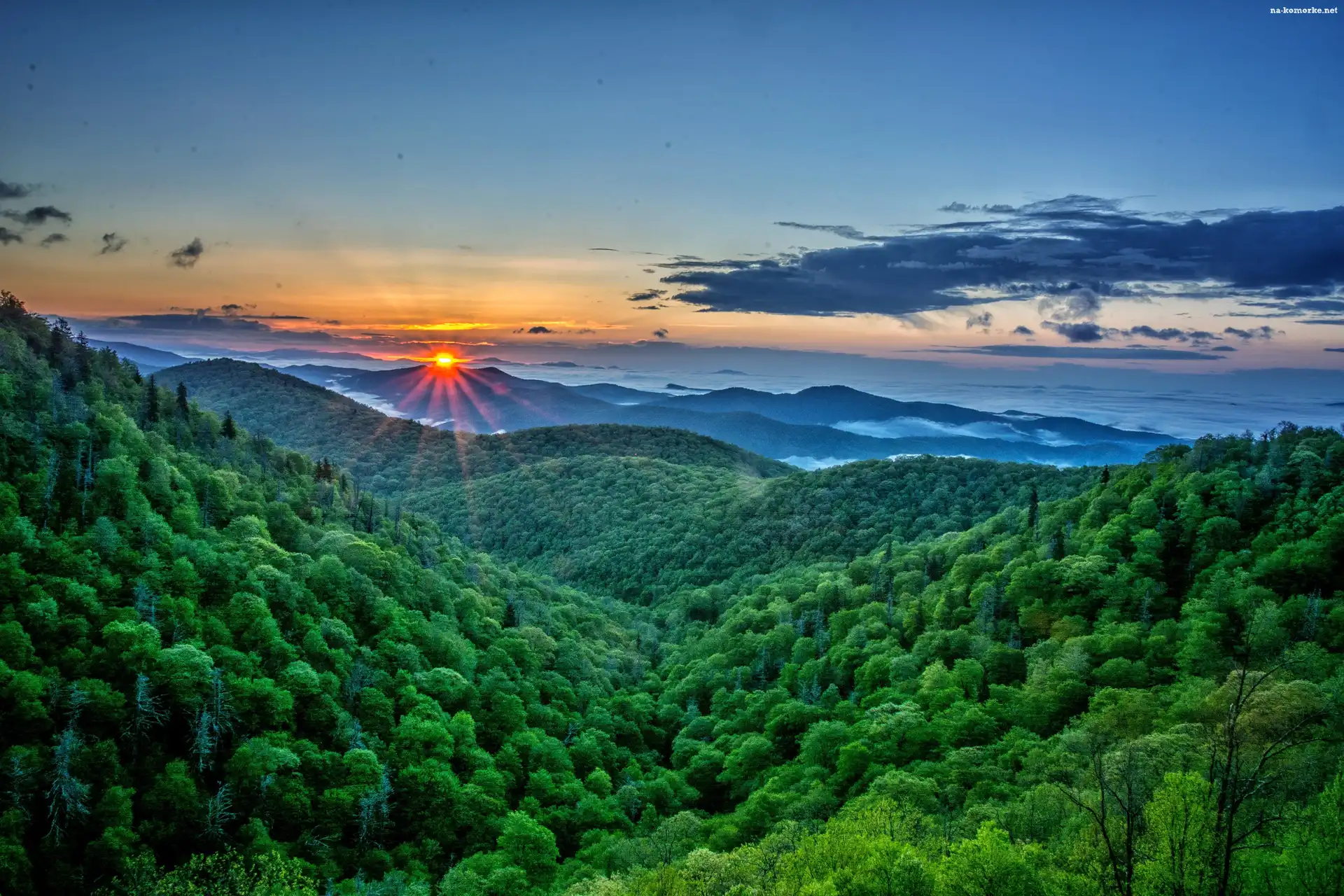 Góry, Roślinność, Las, Zachód słońca na Komórkę