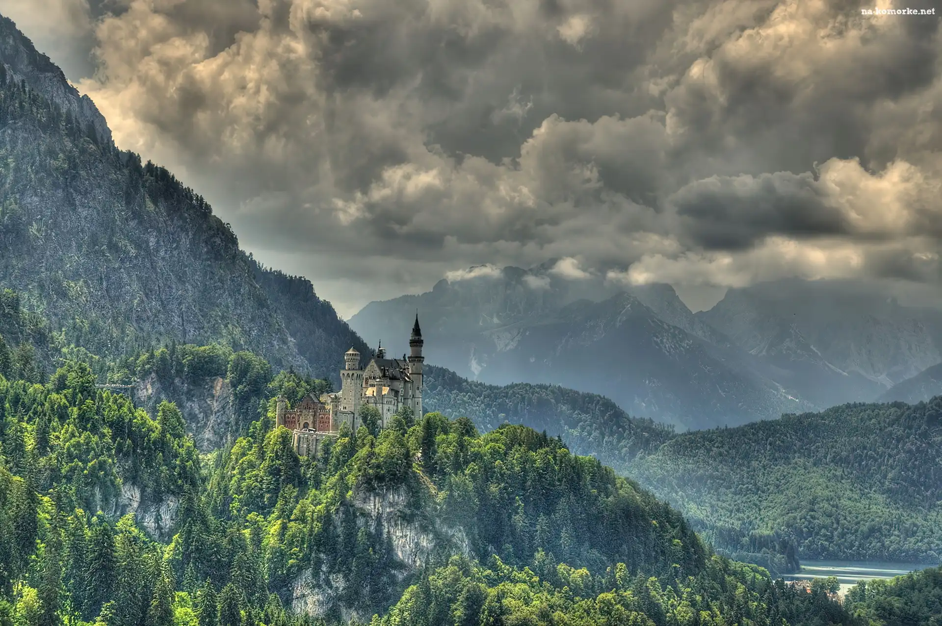 Góry, Neuschwanstein, Zamek, Niemcy, Zalesione, Chmury na Komórkę