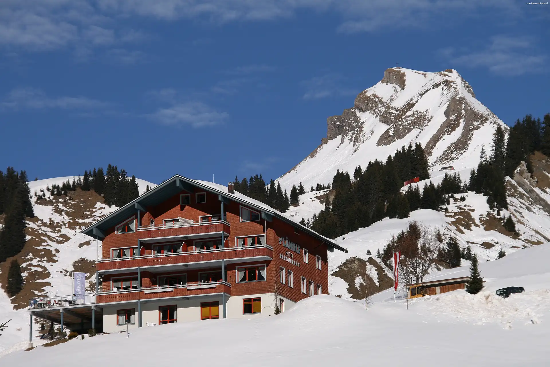 Góry, Austria, Damuls, Śnieg, Zima, Pensjonat na Komórkę