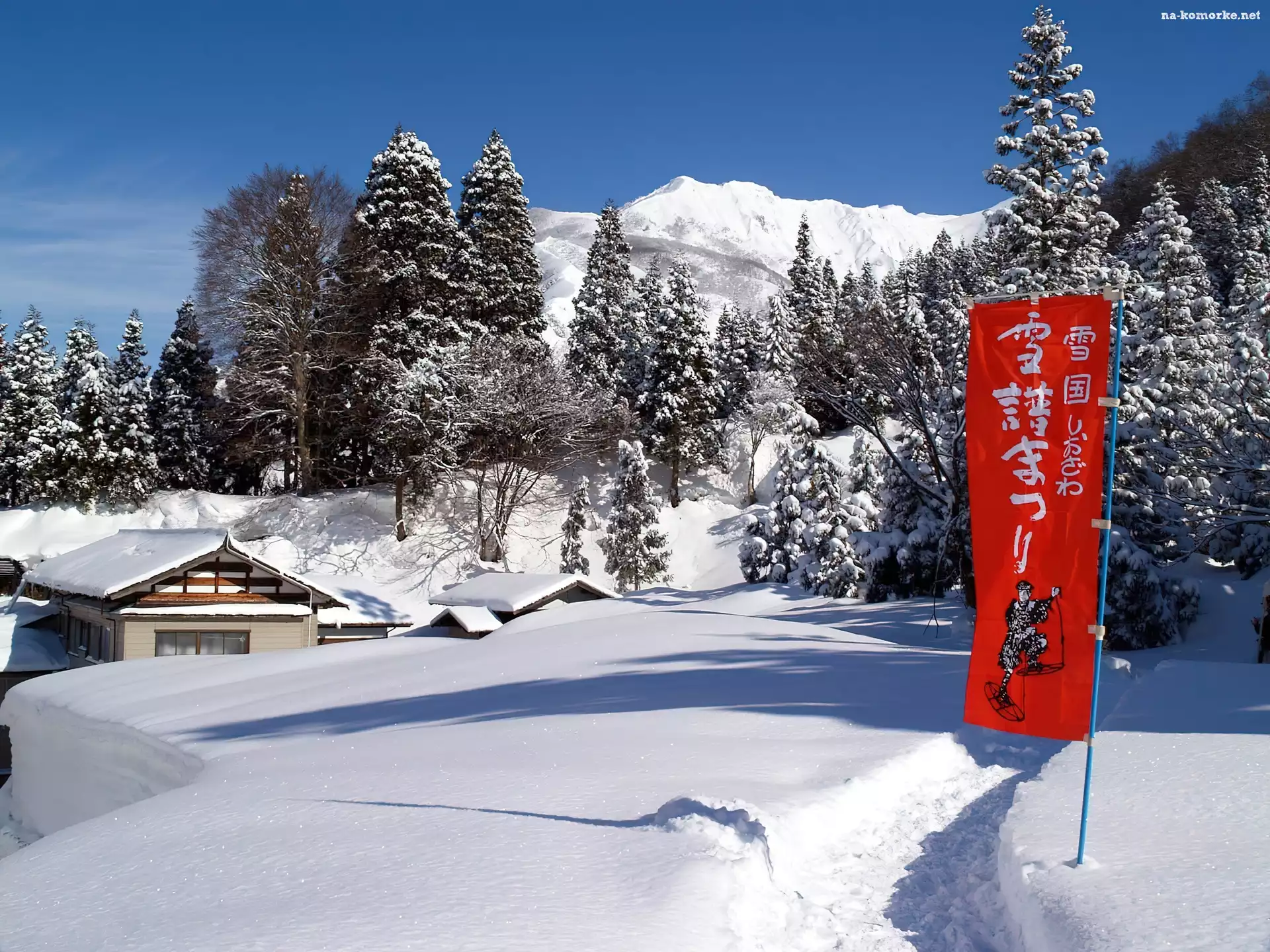 Zima, Góry, Niebo, Dużo, Śniegu, Drzewa, Domy na Komórkę