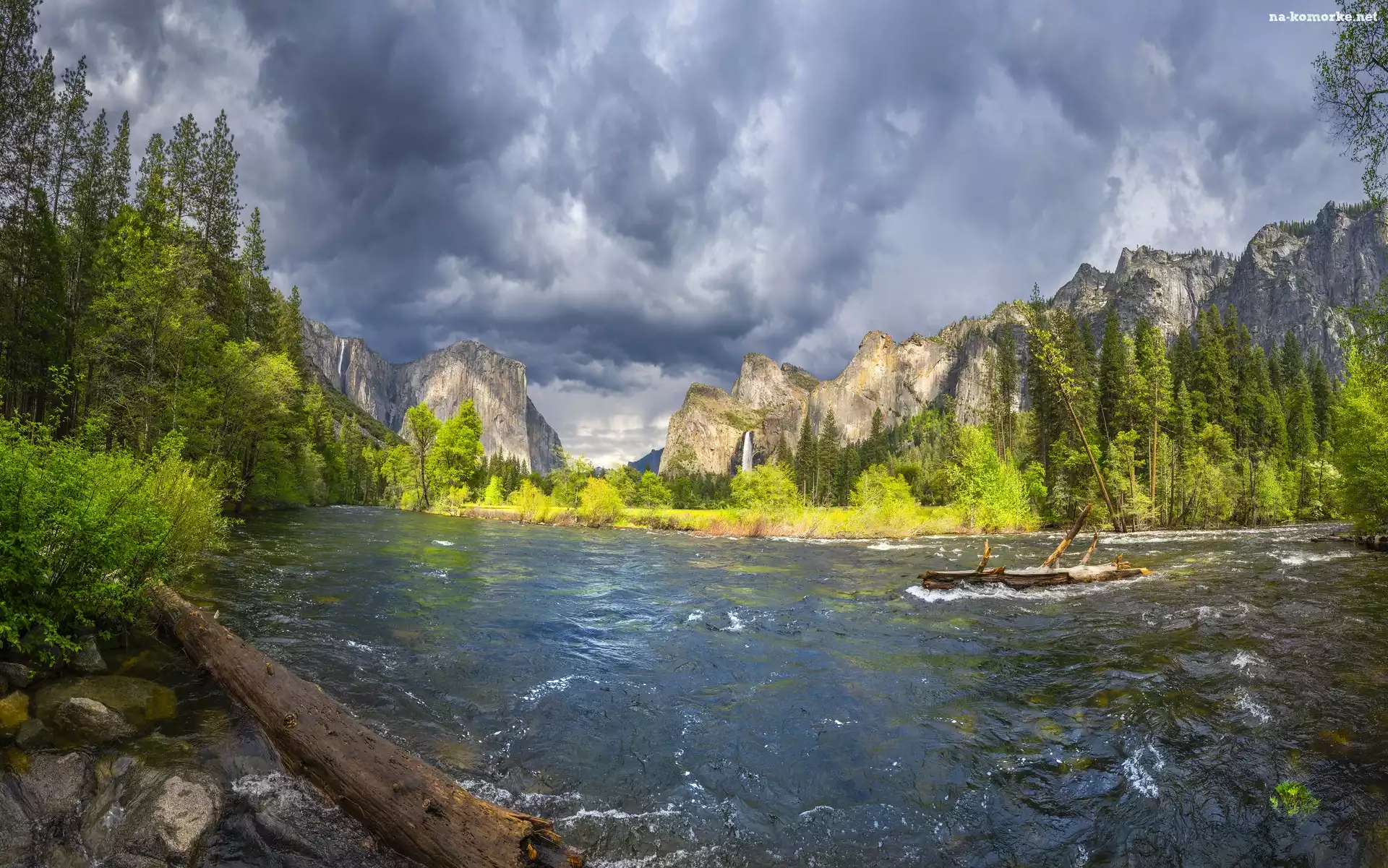 Rzeka, Niebo, Drzewa, Góry, Park Narodowy Yosemite, Kalifornia, Stany Zjednoczone, Chmury, Merced River na Komórkę |