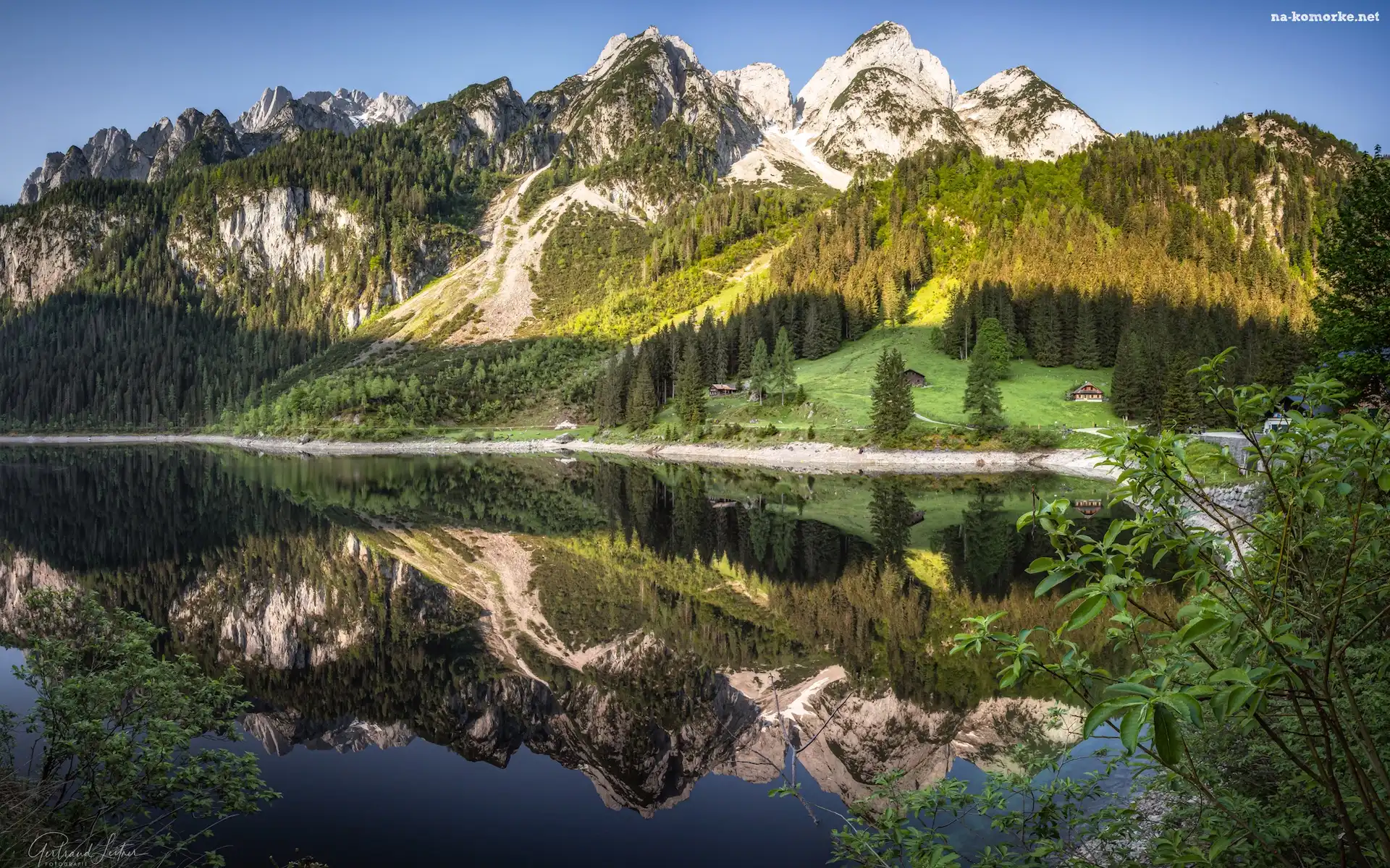 Drzewa, Austria, Jezioro Gosauseen, Odbicie, Dachstein, Góry na Komórkę