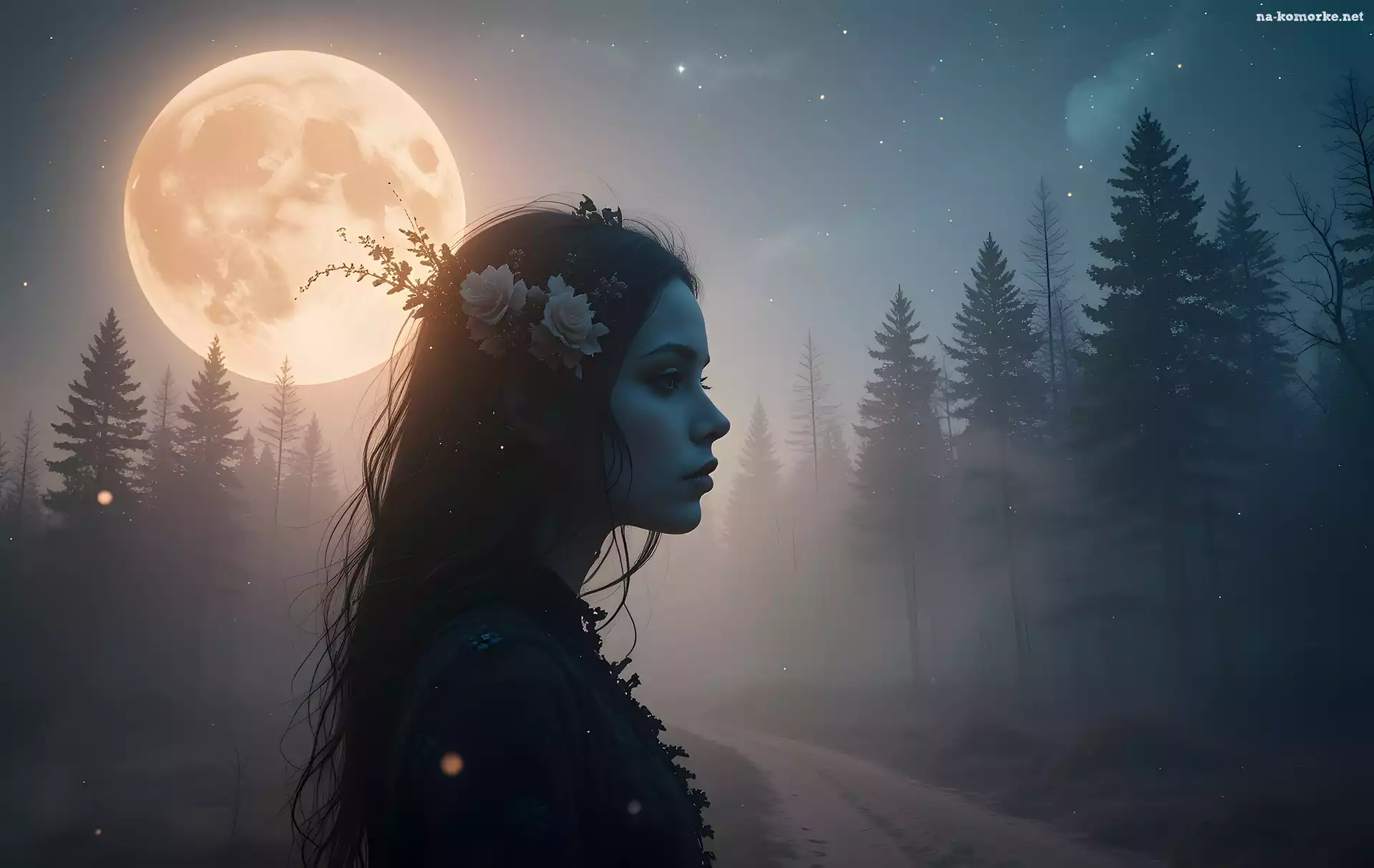Dziewczyna, Grafika AI, Drzewa, Księżyc na Komórkę