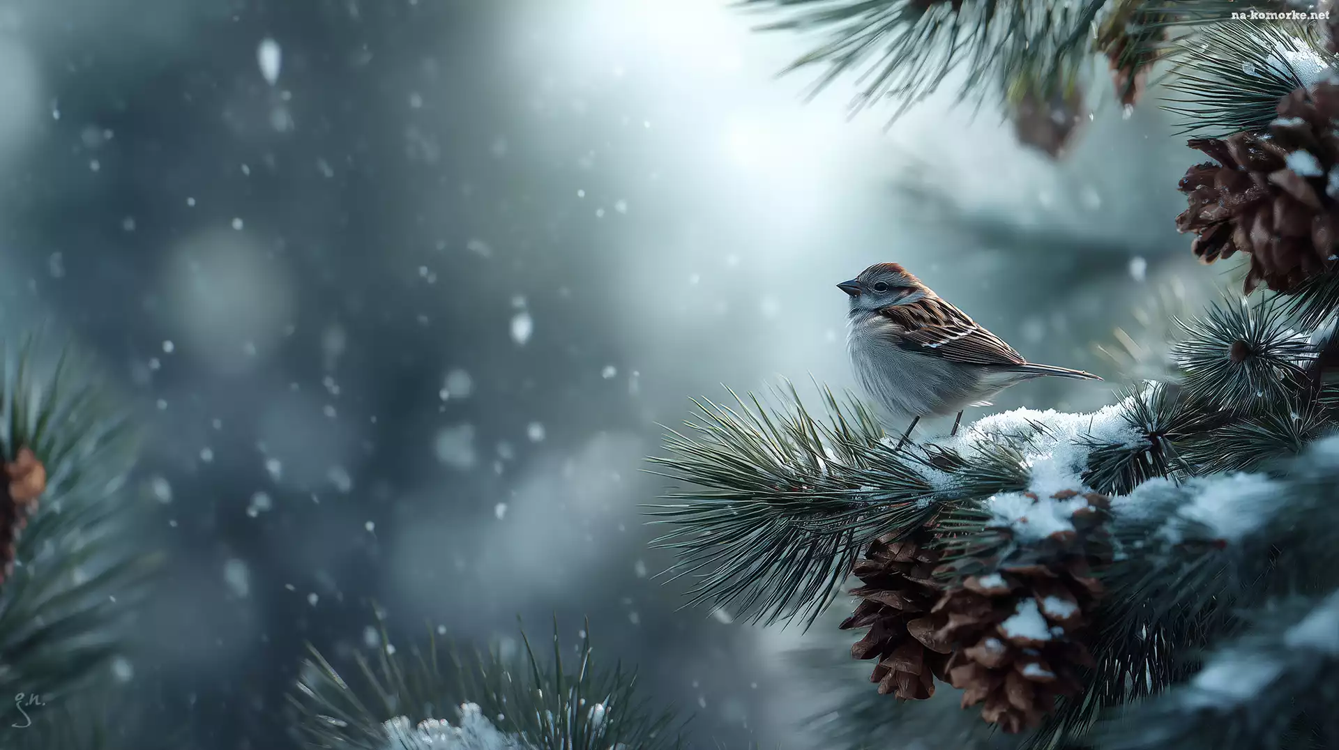 Szyszki, Grafika AI, Wróbel, Sosna na Komórkę