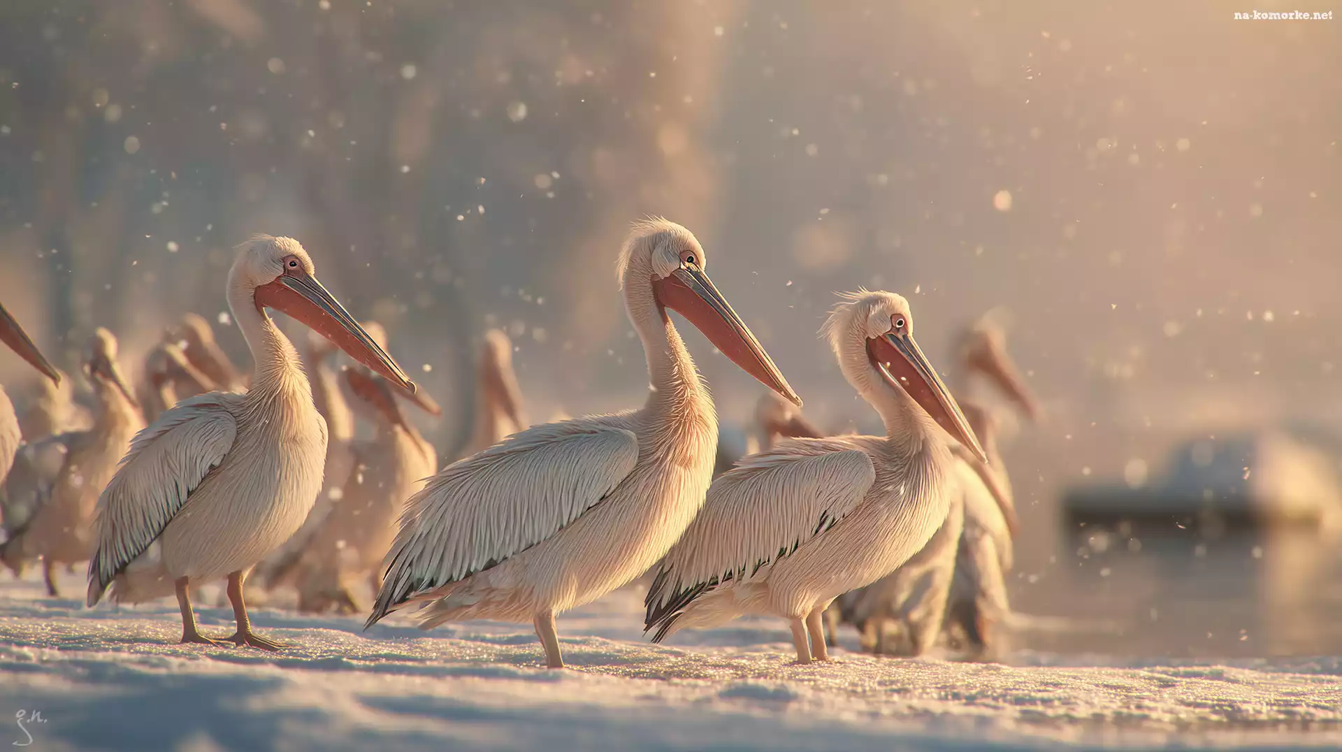 Śnieg, Grafika AI, Pelikany, Zima na Komórkę