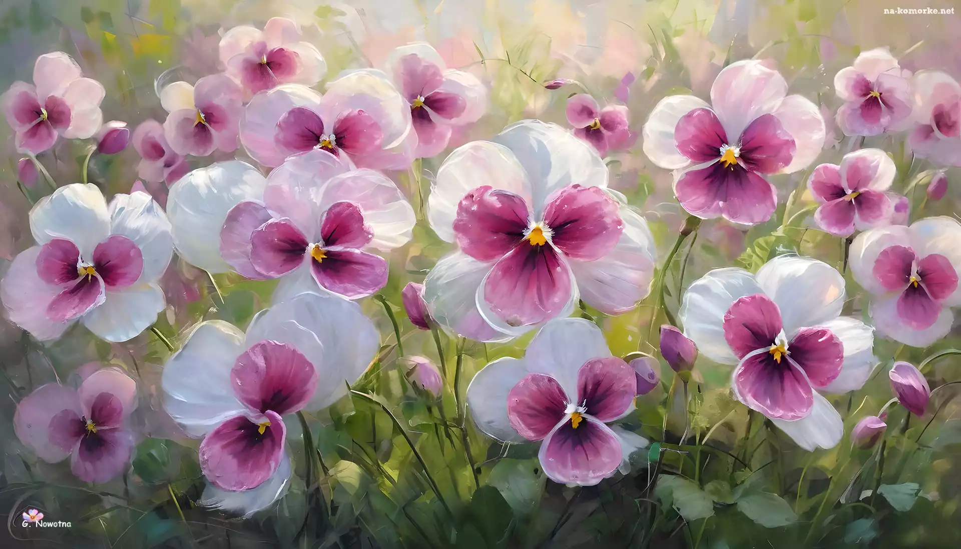 Kwiaty, Grafika, Biało-różowe, Bratki na Komórkę