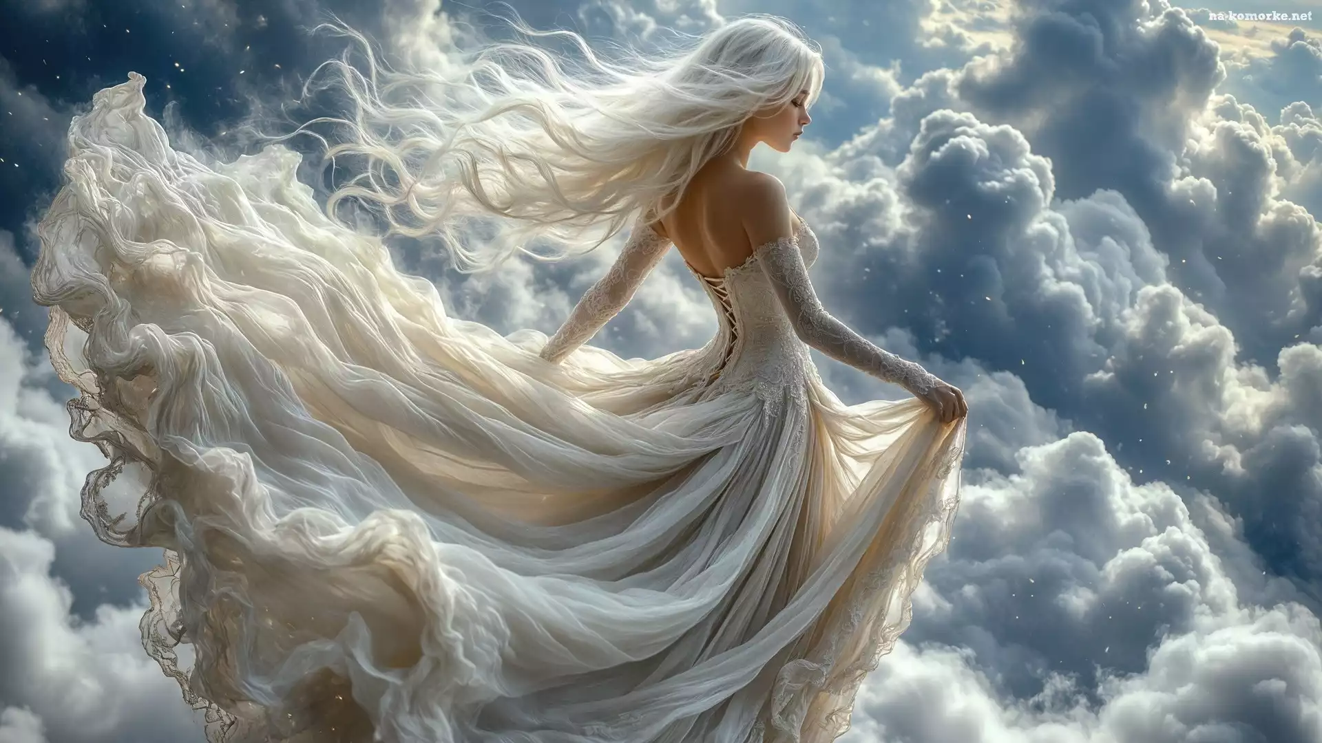 Chmury, Niebo, Blondynka, Grafika, Biała, Suknia, Dziewczyna na Komórkę