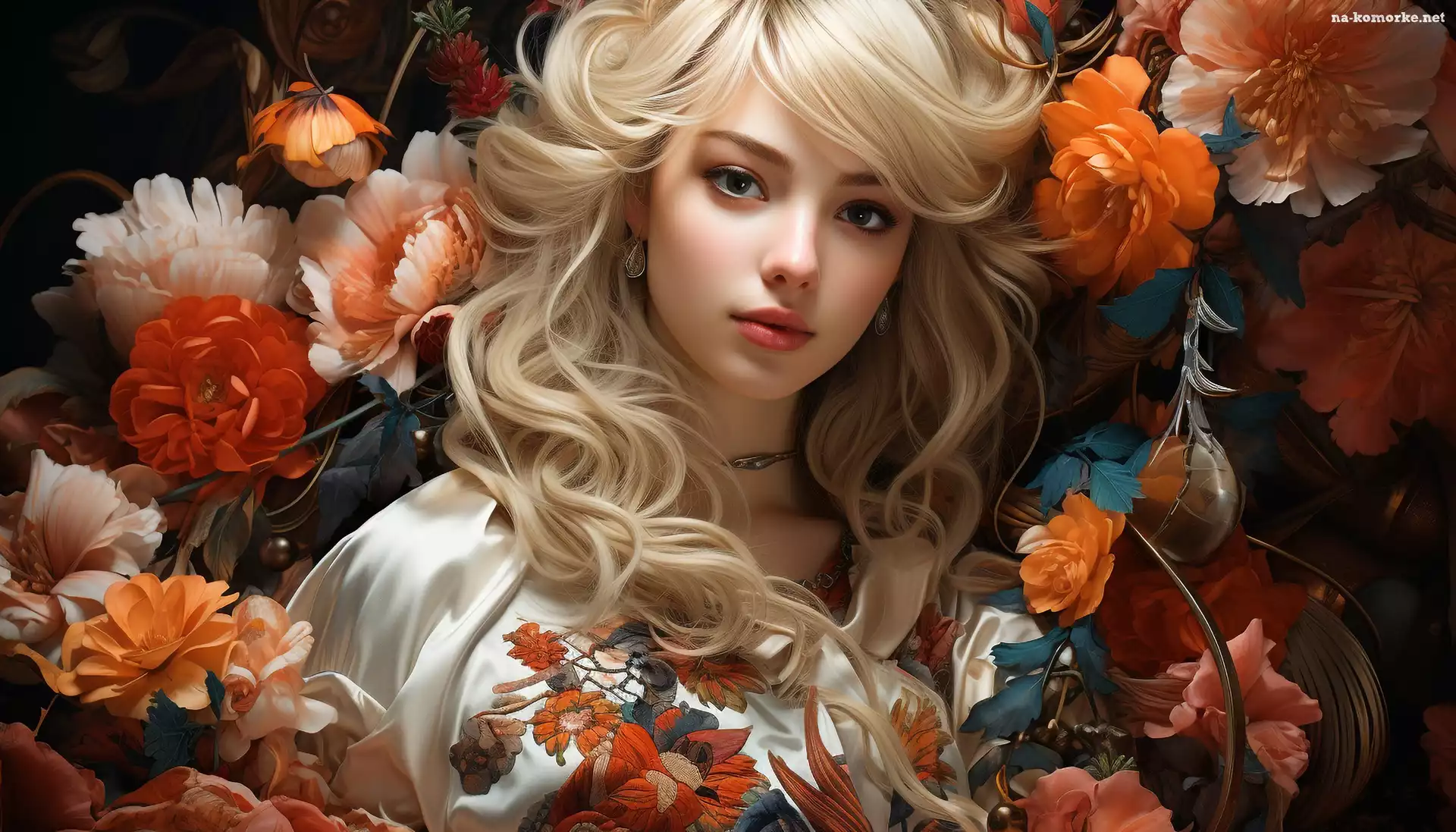 Kwiaty, Dziewczyna, Oczy, Grafika, Ciemne, Blondynka na Komórkę