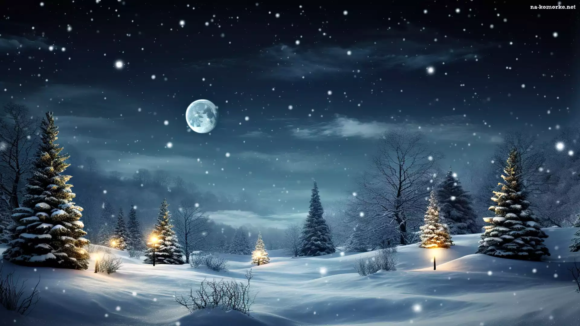 Zima, Drzewa, Oświetlenie, Grafika, Noc, Choinki na Komórkę