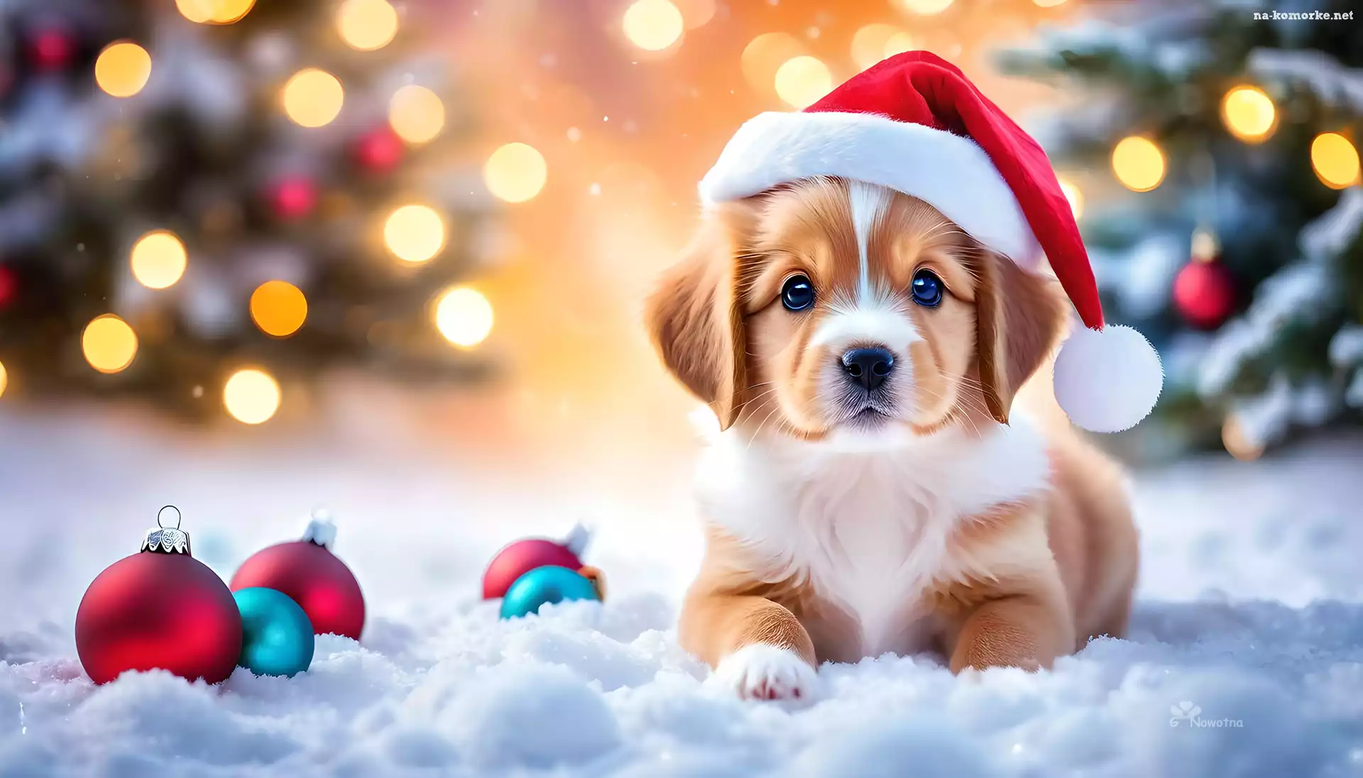Śnieg, Szczeniak, Bombki, Grafika, Mikołaja, Czapka na Komórkę