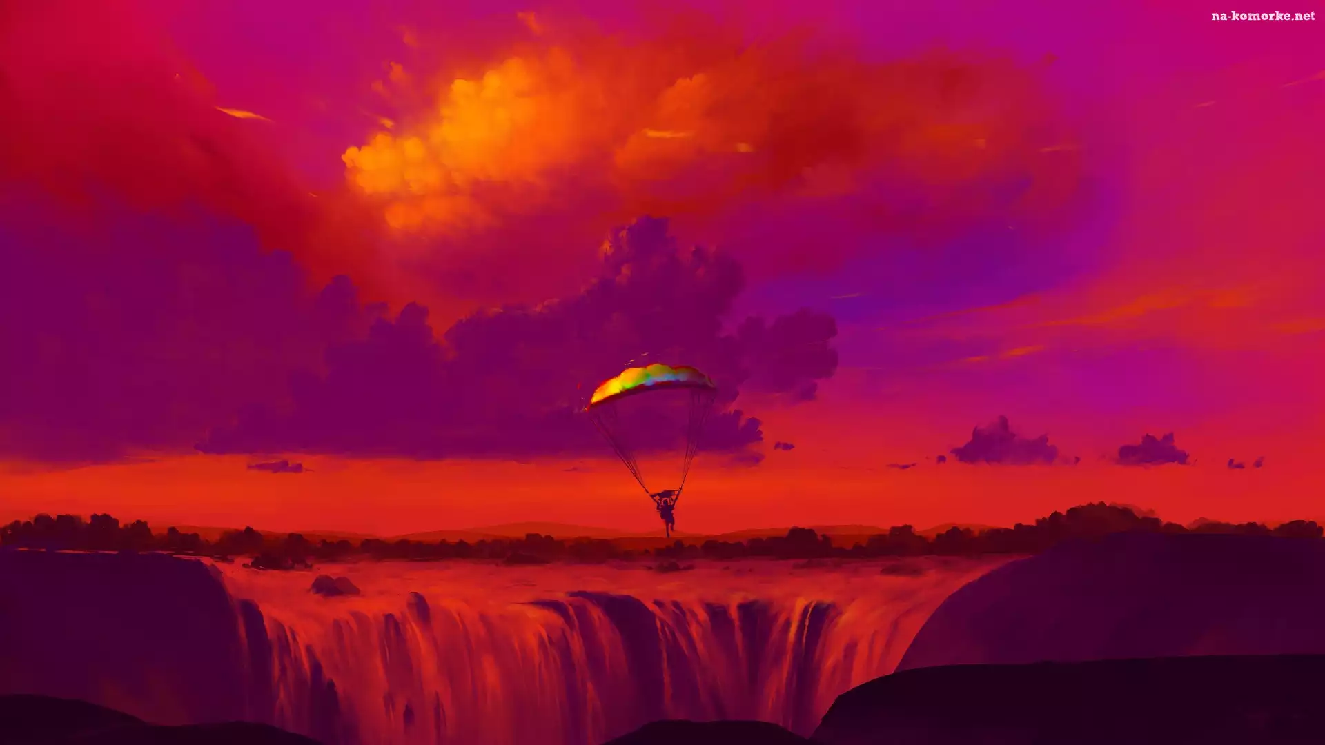 Grafika, Spadochroniarz, Wodospad, Czerwone, Niebo na Komórkę