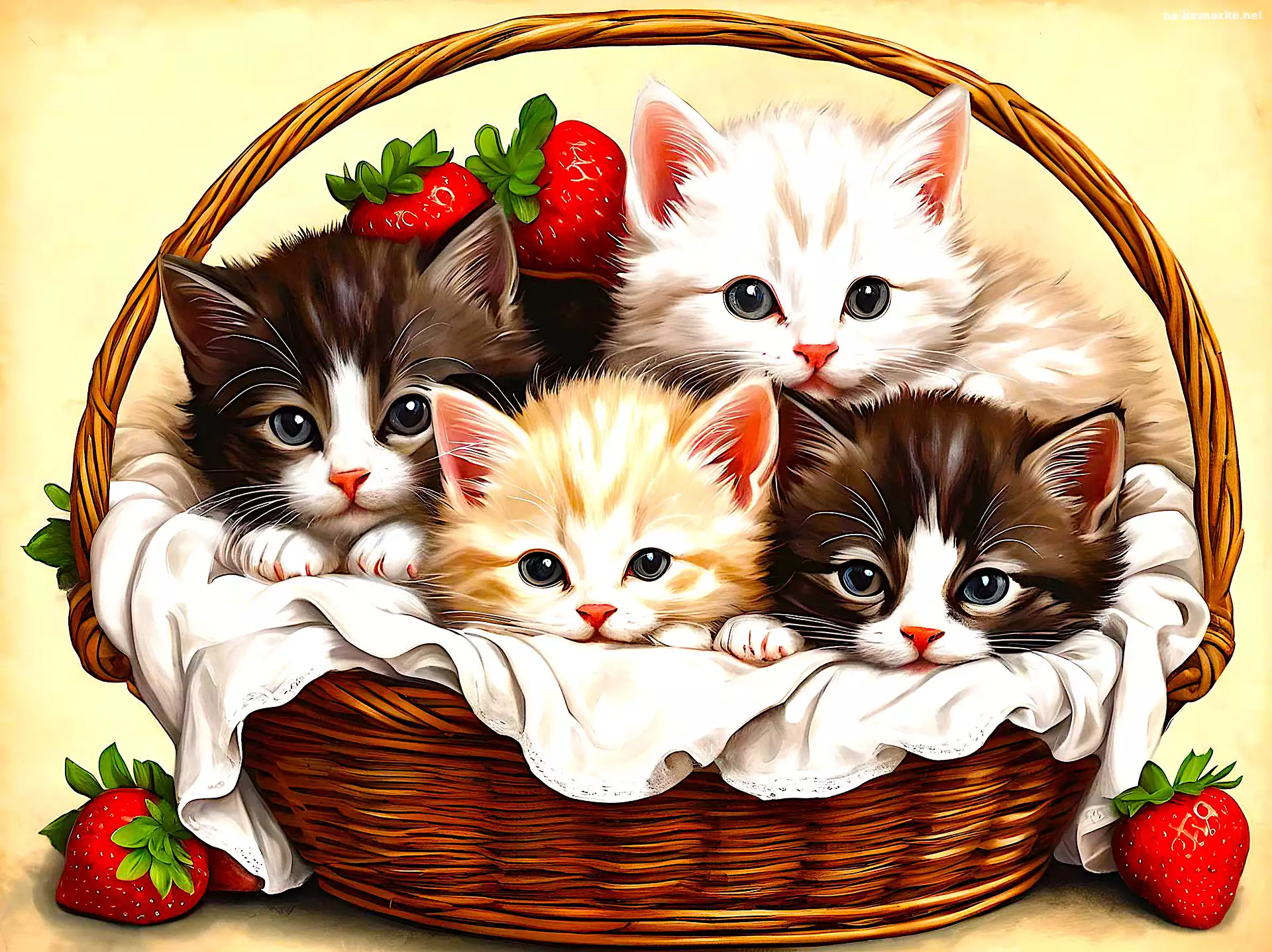 Truskawki, Małe, Koszyk, Grafika, Kotki, Cztery na Komórkę