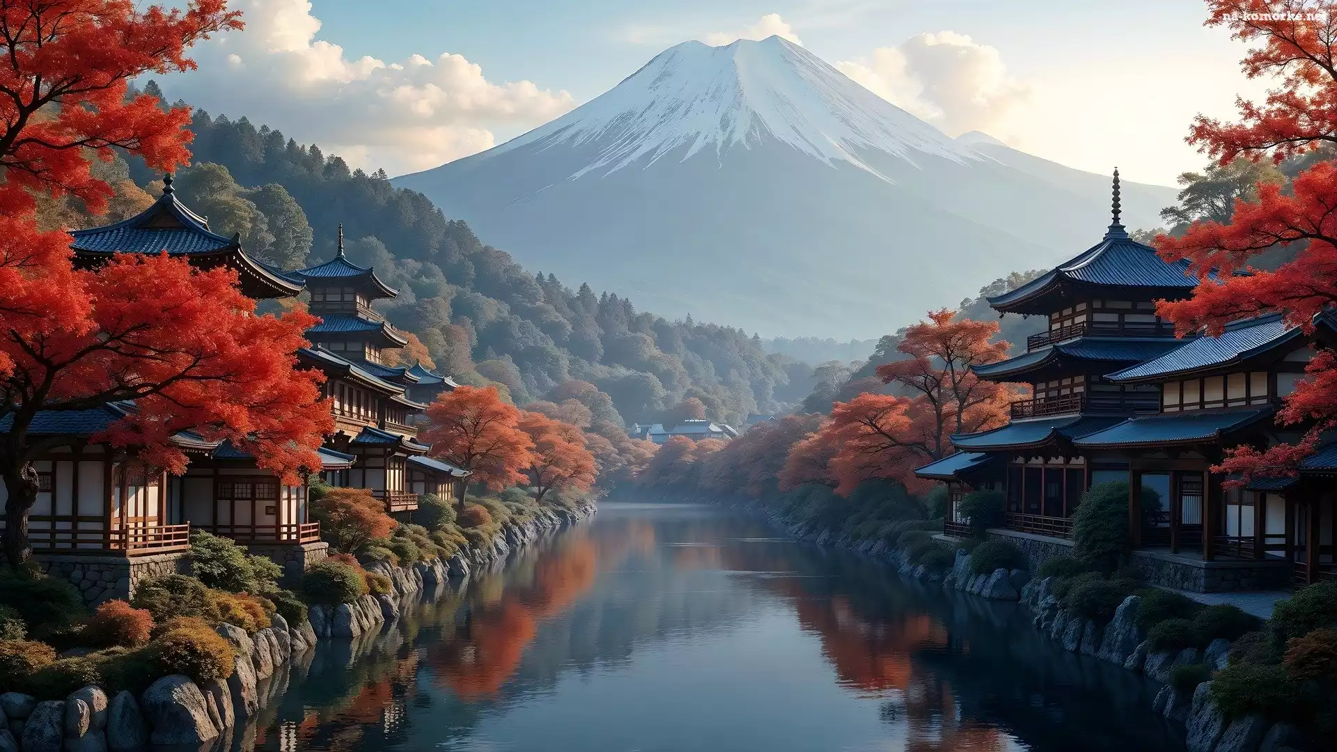 Góra, Jesień, Domy, Grafika AI, Drzewa, Jezioro na Komórkę