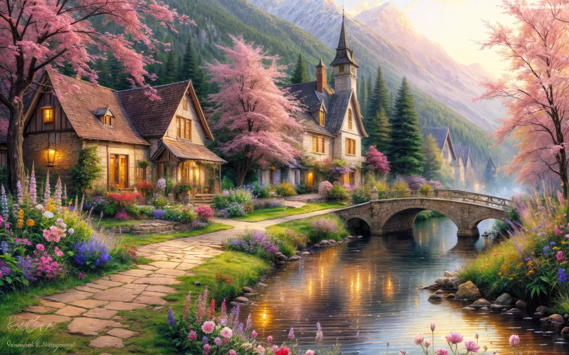 Mostek, Domy, Rzeka, Grafika, Kwiaty, Drzewa na Komórkę