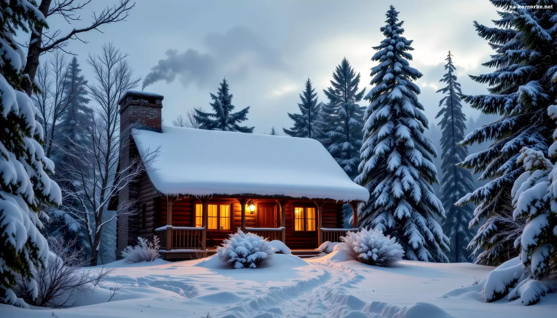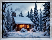 Dym, Zima, Drzewa, Grafika AI, Dom, Oświetlony na Komórkę