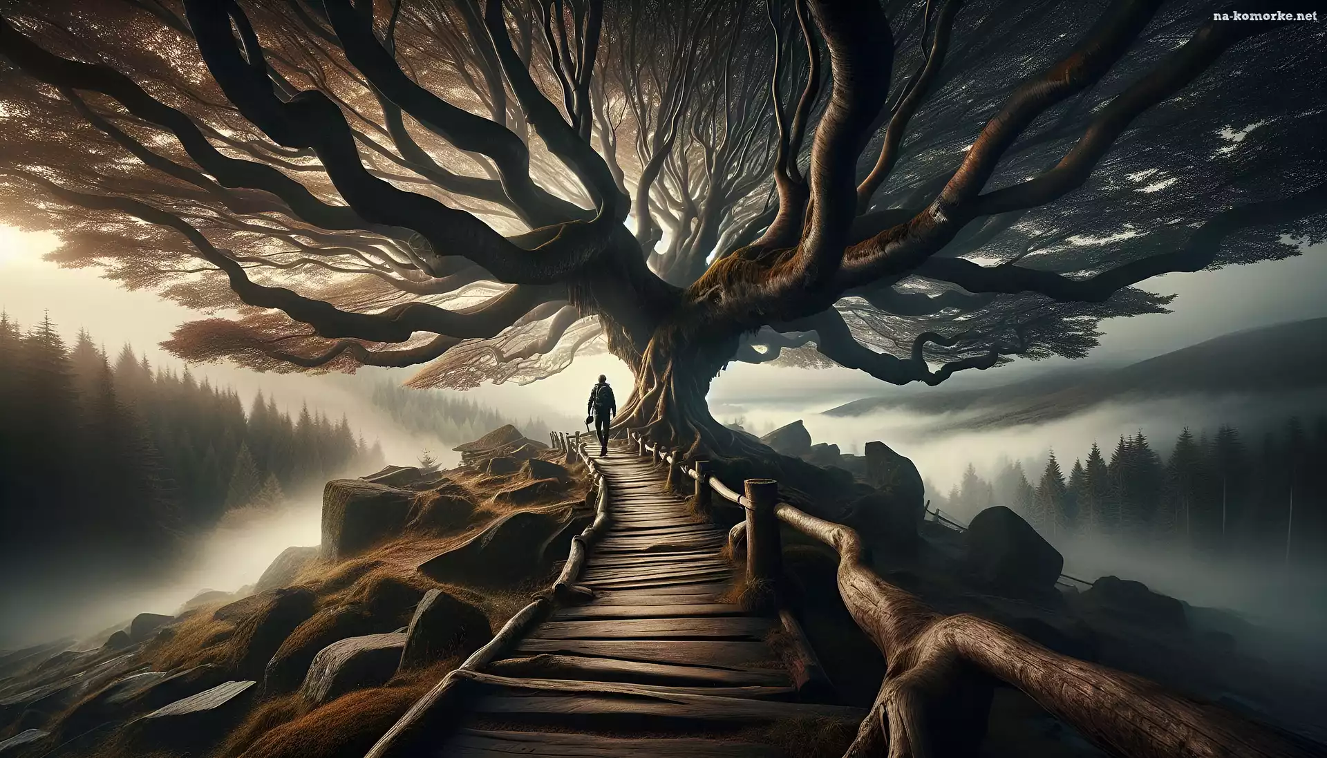 Człowiek, Droga, Góry, Grafika, Mgła, Drzewo na Komórkę