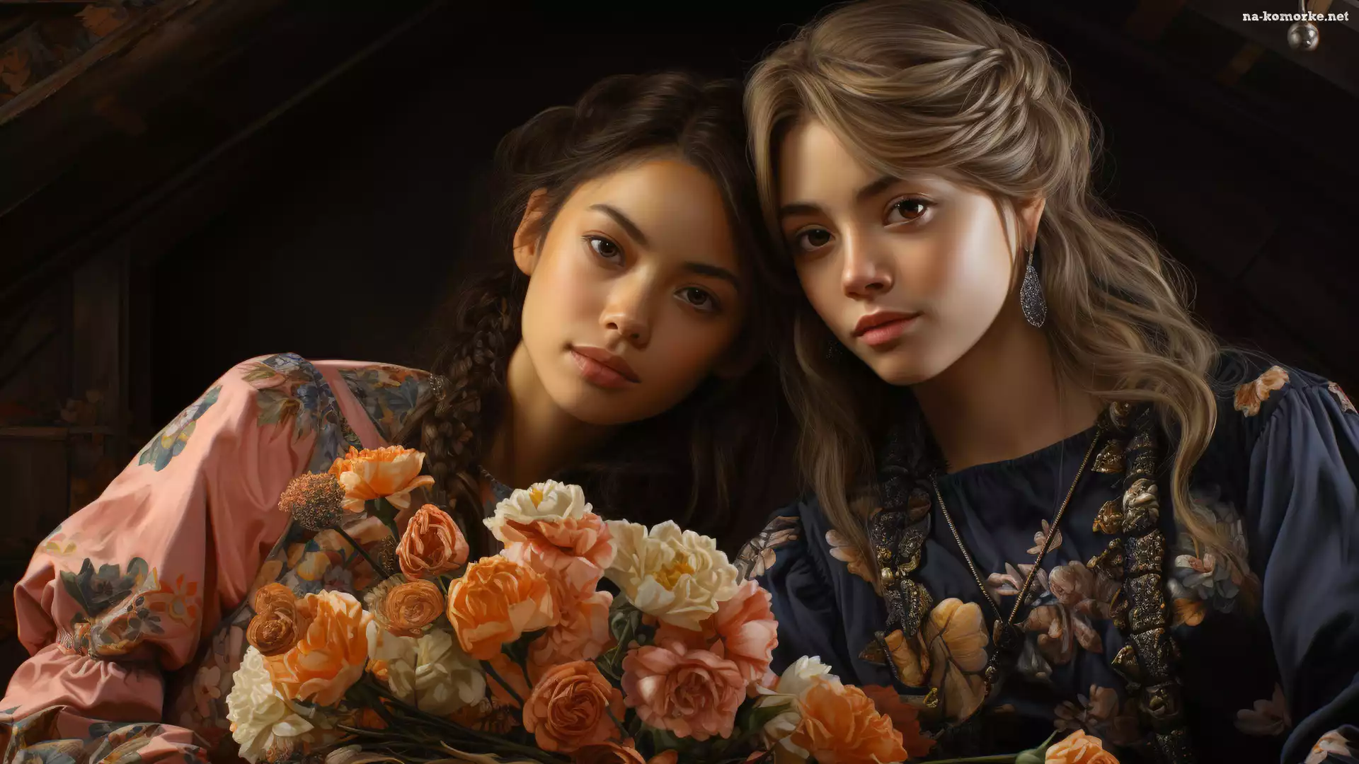 Przyjaciółki, Dwie, Bukiet, Grafika, Kwiaty, Dziewczyny na Komórkę