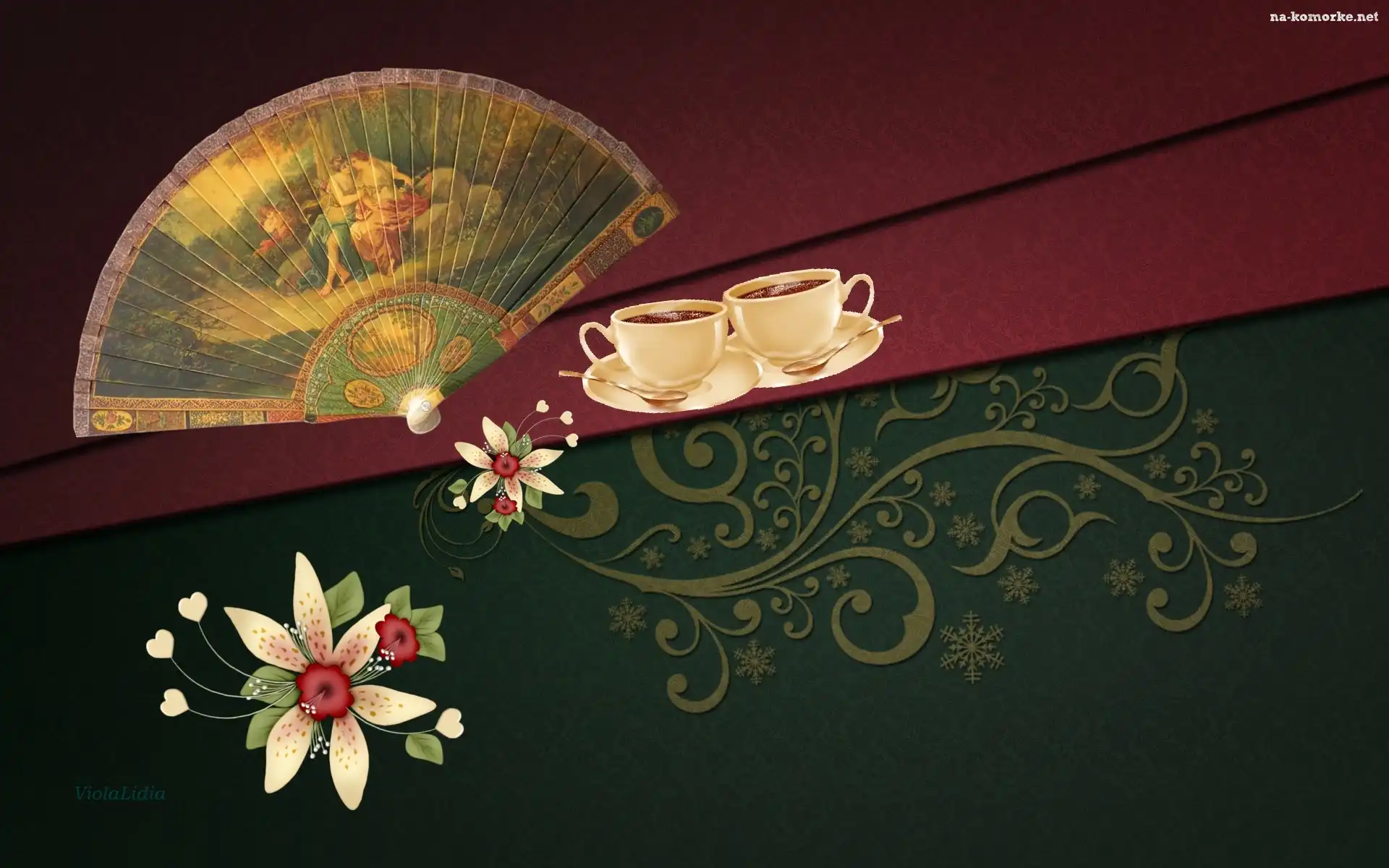 Grafika, Wachlarz, Filiżanki, Kwiaty na Komórkę